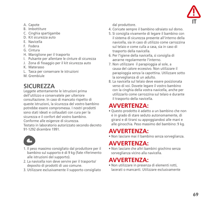 J. Zona di fissaggio per il kit sicurezza auto K. Materasso L. Tasca per conservare le istruzioni M. Grembiule SICUREZZA Leggete attentamente le istruzioni prima dell’utilizzo e conservatele per ulteriore consultazione. In caso di mancato rispetto di queste istruzioni, la sicurezza del vostro bambino potrebbe essere compromessa. I nostri prodotti sono stati ideati e collaudati con cura per la sicurezza e il confort del vostro bambino. Conforme alle esigenze di sicurezza. Testato in laboratorio autorizzato secondo decreto 91-1292 dicembre 1991. dal produttore.