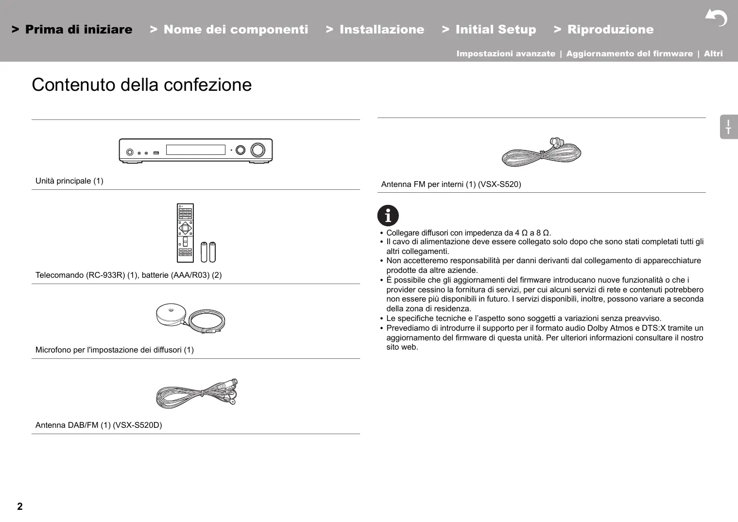 Prima di iniziare Contenuto della confezione 2 Nome dei componenti Pannello frontale 3 Pannello posteriore 4 Telecomando 6 Display 7 Installazione 1. Collegare i diffusori 8 2. Collegare il televisore 11 3. Collegare i componenti HDMI AV 12 4. Collegare i componenti Audio 13 5. Collegare gli altri cavi 14 Initial Setup Initial Setup con installazione guidata 15 Riproduzione Riproduzione di un componente AV 18 Internet radio 19 Spotify 21 Music Server 22 Dispositivo di archiviazione USB 24 AirPlay® 26 Riproduzione BLUETOOTH® 27 Ascolto della radio FM/DAB 28 Modalità di Ascolto 31 AV Adjust 40 Impostazioni avanzate System Setup 42 MCACC 51 Network/Bluetooth 54 Aggiornamento del firmware Aggiornamento del firmware 57 Altri Risoluzione dei problemi 60 Caratteristiche generali 65 Informazioni su HDMI 67 Informazioni di licenza e dei marchi 68