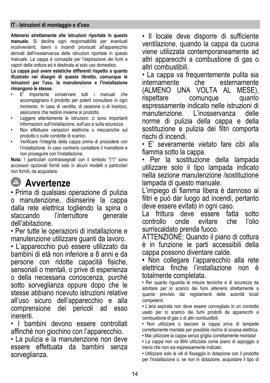 La campana puede ser diferente con respecto a los dibujos de este manual, aunque las instrucciones para su uso, la manutención y la instalación son las mismas. • Es importante guardar este manual para poder consultar si fuera necesario.En el caso de venta,de inutilidad o de mudanza, asegurarse que quede junto al producto. • Leer atentamente las instrucciones:contiene importantes informaciones sobre la instalación,el uso y la seguridad. • No realizar variaciones electricas o mecanicas en el producto o en el tubo de escape. • Antes de instalar el aparato,controlar que todas sus partes no estèn dañadas. En caso contrario llamar al revendedor y no realizar la instalaciòn. Nota: Los elementos que están marcados con el símbolo "(*)" son accesorios opcionales suministrados únicamente con algunos modelos o elementos no suministrados, que deben comprarse a parte.