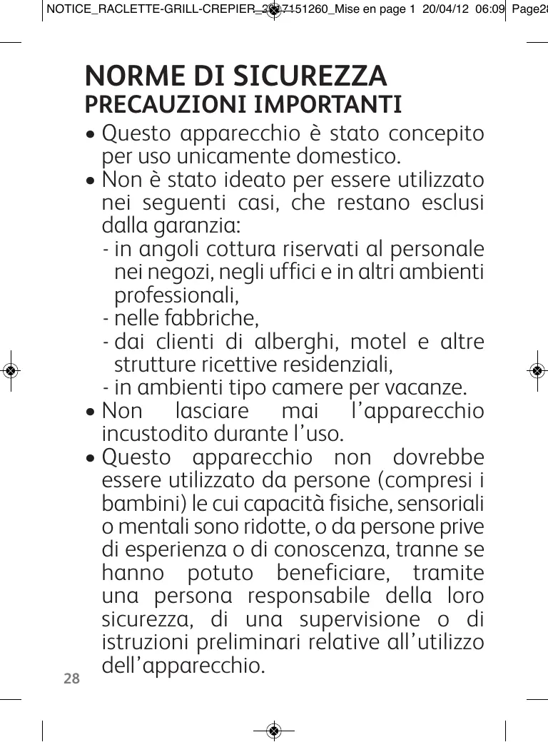 NORME DI SICUREZZA PRECAUZIONI IMPORTANTI • Questo apparecchio è stato concepito per uso unicamente domestico. • Non è stato ideato per essere utilizzato nei seguenti casi, che restano esclusi dalla garanzia: - in angoli cottura riservati al personale nei negozi, negli uffici e in altri ambienti professionali, - nelle fabbriche, - dai clienti di alberghi, motel e altre strutture ricettive residenziali, - in ambienti tipo camere per vacanze. • Non lasciare mai l’apparecchio incustodito durante l’uso. • Questo apparecchio non dovrebbe essere utilizzato da persone (compresi i bambini) le cui capacità fisiche, sensoriali o mentali sono ridotte, o da persone prive di esperienza o di conoscenza, tranne se hanno potuto beneficiare, tramite una persona responsabile della loro sicurezza, di una supervisione o di istruzioni preliminari relative all’utilizzo dell’apparecchio. 28