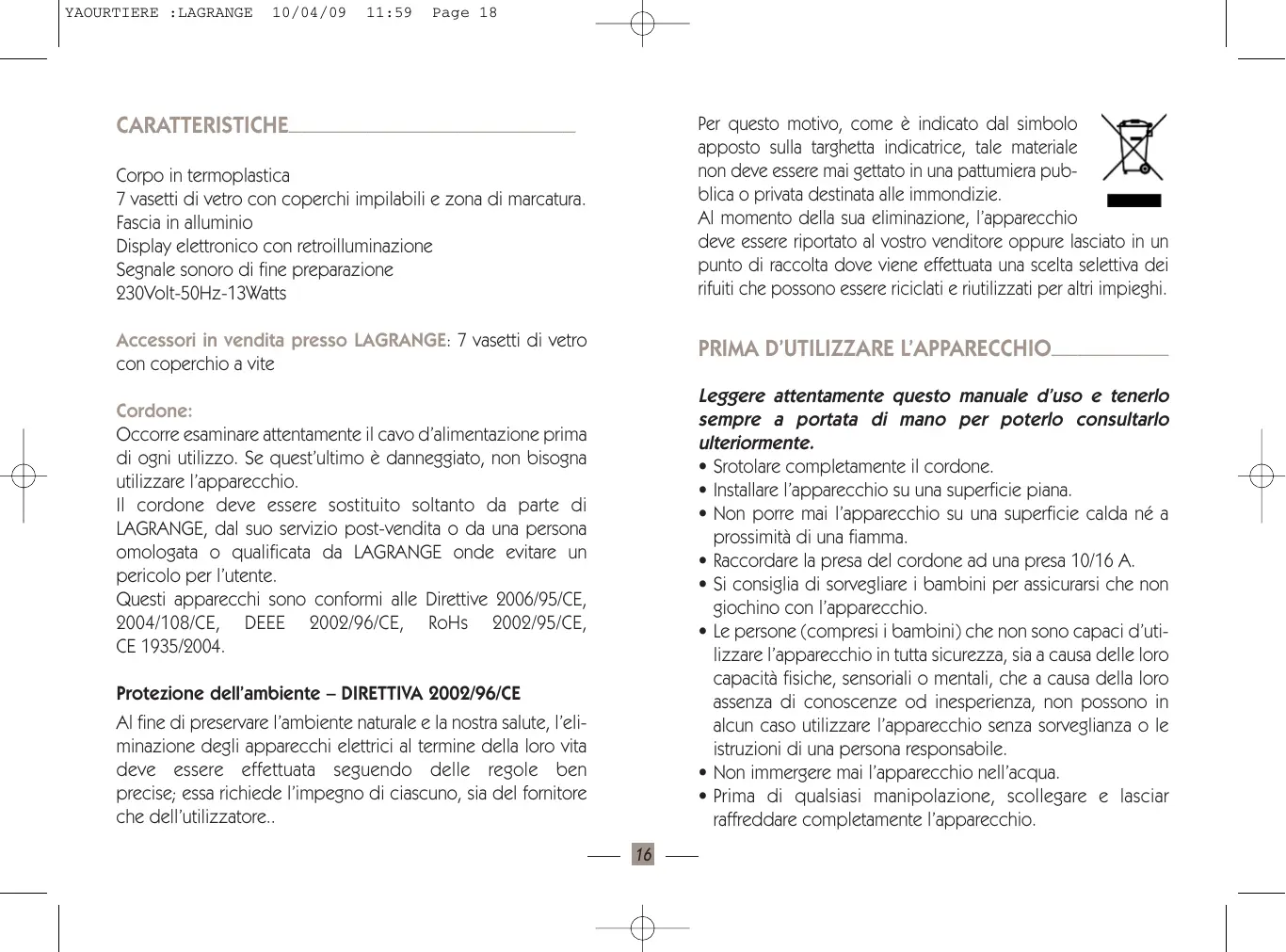 • Prima di qualsiasi manipolazione, scollegare e lasciar raffreddare completamente l’apparecchio. Cordone: Occorre esaminare attentamente il cavo d’alimentazione prima di ogni utilizzo. Se quest’ultimo è danneggiato, non bisogna utilizzare l’apparecchio. Il cordone deve essere sostituito soltanto da parte di LAGRANGE, dal suo servizio post-vendita o da una persona omologata o qualificata da LAGRANGE onde evitare un pericolo per l’utente. Questi apparecchi sono conformi alle Direttive 2006/95/CE, 2004/108/CE, DEEE 2002/96/CE, RoHs 2002/95/CE, CE 1935/2004. Protezione dell’ambiente – DIRETTIVA 2002/96/CE Al fine di preservare l’ambiente naturale e la nostra salute, l’eliminazione degli apparecchi elettrici al termine della loro vita deve essere effettuata seguendo delle regole ben precise; essa richiede l’impegno di ciascuno, sia del fornitore che dell’utilizzatore..