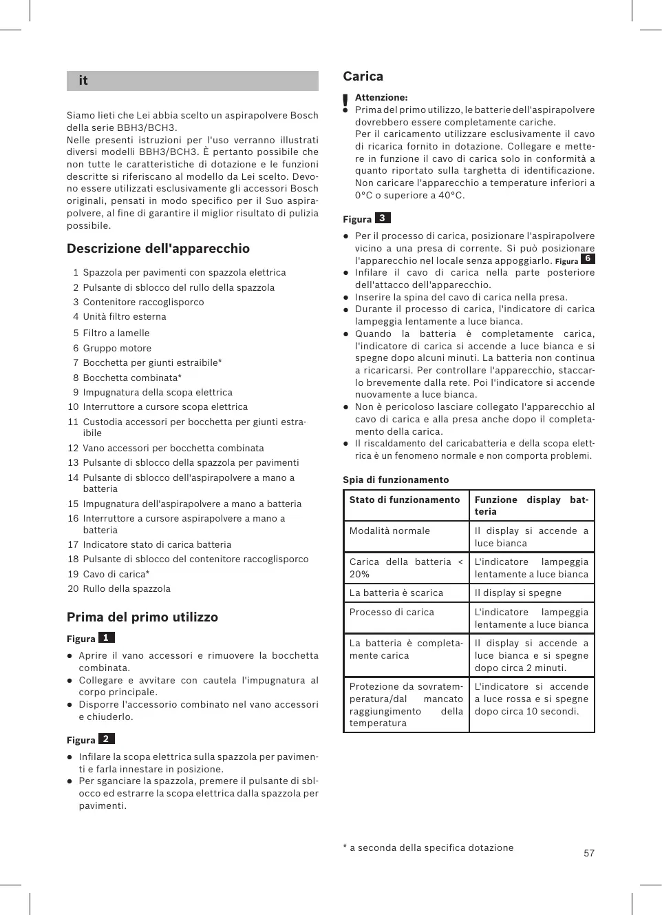Siamo lieti che Lei abbia scelto un aspirapolvere Bosch della serie BBH3/BCH3. Nelle presenti istruzioni per l'uso verranno illustrati diversi modelli BBH3/BCH3. È pertanto possibile che non tutte le caratteristiche di dotazione e le funzioni descritte si riferiscano al modello da Lei scelto. Devono essere utilizzati esclusivamente gli accessori Bosch originali, pensati in modo specifico per il Suo aspirapolvere, al fine di garantire il miglior risultato di pulizia possibile. Descrizione dell'apparecchio 1 Spazzola per pavimenti con spazzola elettrica 2 Pulsante di sblocco del rullo della spazzola Carica