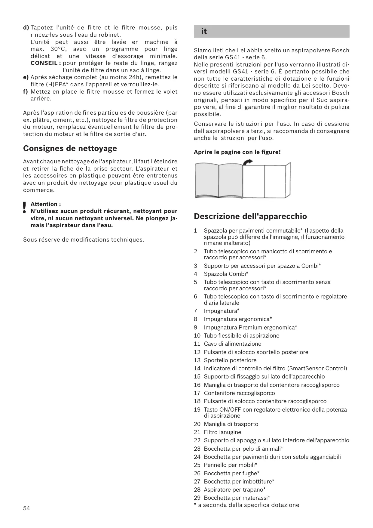 it Siamo lieti che Lei abbia scelto un aspirapolvere Bosch della serie GS41 - serie 6. Nelle presenti istruzioni per l'uso verranno illustrati diversi modelli GS41 - serie 6. È pertanto possibile che non tutte le caratteristiche di dotazione e le funzioni descritte si riferiscano al modello da Lei scelto. Devono essere utilizzati esclusivamente gli accessori Bosch originali, pensati in modo specifico per il Suo aspirapolvere, al fine di garantire il miglior risultato di pulizia possibile. Conservare le istruzioni per l'uso. In caso di cessione dell'aspirapolvere a terzi, si raccomanda di consegnare anche le istruzioni per l'uso. Aprire le pagine con le figure!