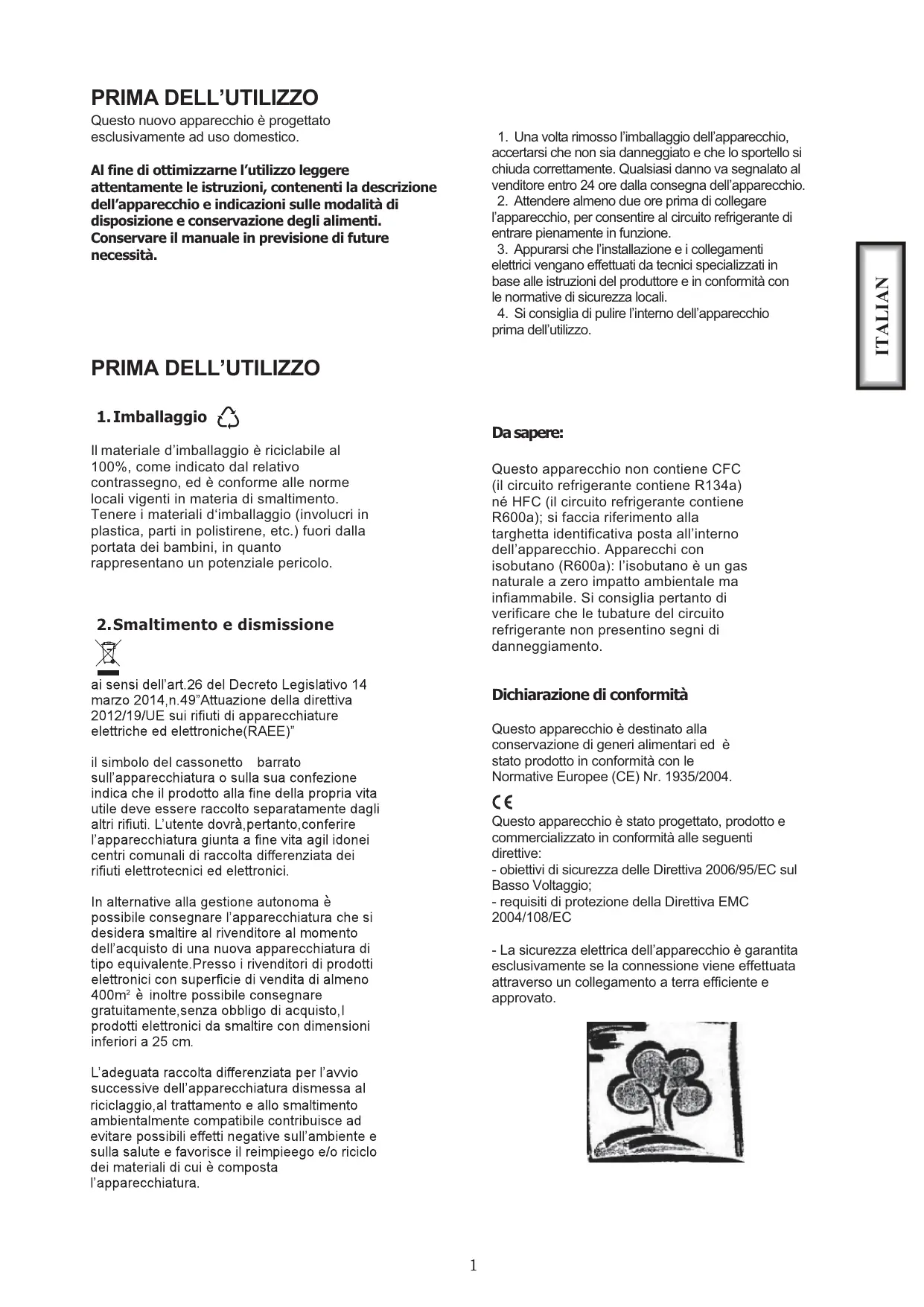 Da sapere: Il materiale d’imballaggio è riciclabile al 100%, come indicato dal relativo contrassegno, ed è conforme alle norme locali vigenti in materia di smaltimento. Tenere i materiali d‘imballaggio (involucri in plastica, parti in polistirene, etc.) fuori dalla portata dei bambini, in quanto rappresentano un potenziale pericolo. Questo apparecchio non contiene CFC (il circuito refrigerante contiene R134a) né HFC (il circuito refrigerante contiene R600a); si faccia riferimento alla targhetta identificativa posta all’interno dell’apparecchio. Apparecchi con isobutano (R600a): l’isobutano è un gas naturale a zero impatto ambientale ma infiammabile. Si consiglia pertanto di verificare che le tubature del circuito refrigerante non presentino segni di danneggiamento. 2.Smaltimento e dismissione Dichiarazione di conformità Questo apparecchio è destinato alla conservazione di generi alimentari ed è stato prodotto in conformità con le Normative Europee (CE) Nr. 1935/2004. Questo apparecchio è stato progettato, prodotto e commercializzato in conformità alle seguenti direttive: - obiettivi di sicurezza delle Direttiva 2006/95/EC sul Basso Voltaggio; - requisiti di protezione della Direttiva EMC 2004/108/EC - La sicurezza elettrica dell’apparecchio è garantita esclusivamente se la connessione viene effettuata attraverso un collegamento a terra efficiente e approvato.