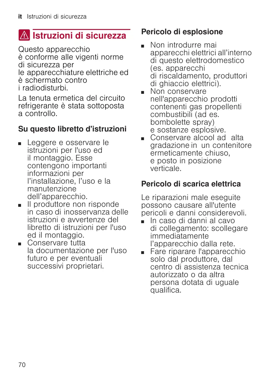 ( Istruzioni di sicurezza Questo apparecchio è conforme alle vigenti norme di sicurezza per le apparecchiature elettriche ed è schermato contro i radiodisturbi. La tenuta ermetica del circuito refrigerante è stata sottoposta a controllo.