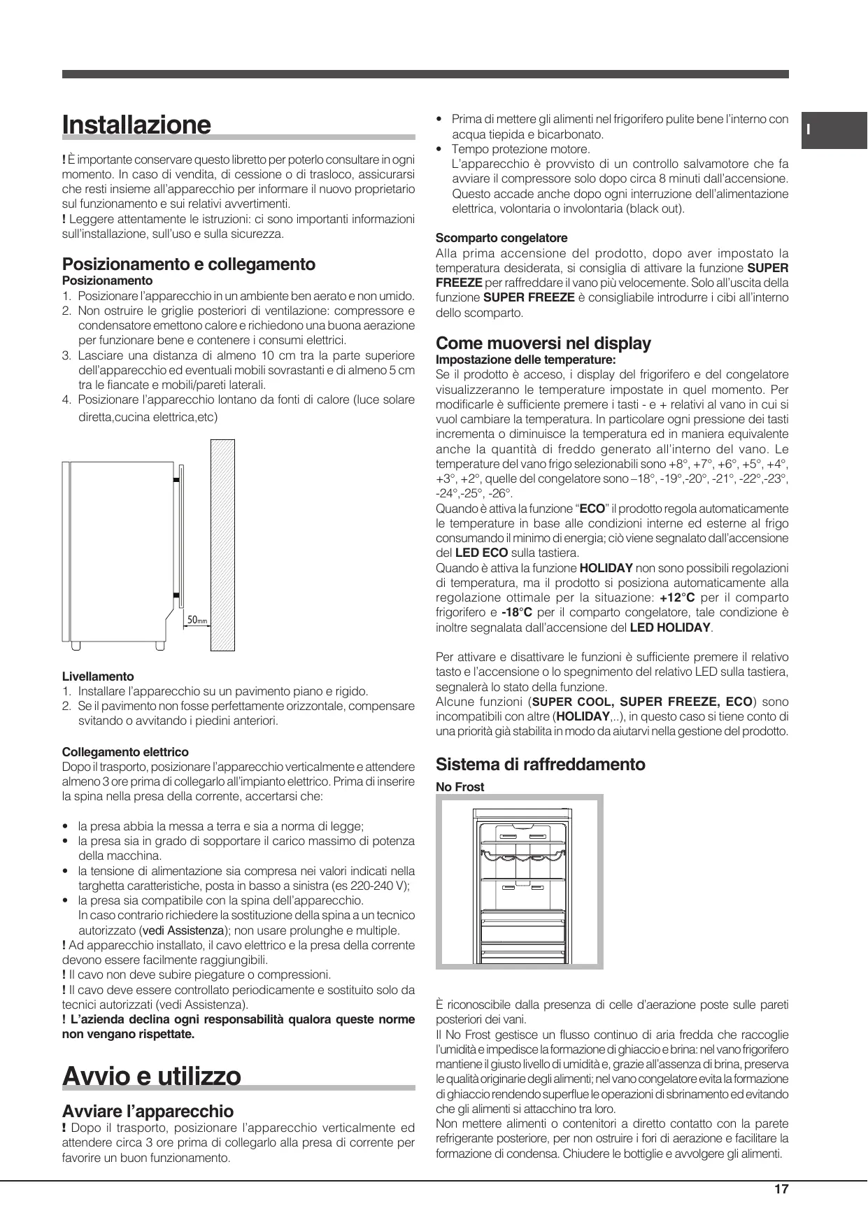 È riconoscibile dalla presenza di celle d’aerazione poste sulle pareti posteriori dei vani. Il No Frost gestisce un flusso continuo di aria fredda che raccoglie l’umidità e impedisce la formazione di ghiaccio e brina: nel vano frigorifero mantiene il giusto livello di umidità e, grazie all’assenza di brina, preserva le qualità originarie degli alimenti; nel vano congelatore evita la formazione di ghiaccio rendendo superflue le operazioni di sbrinamento ed evitando che gli alimenti si attacchino tra loro. Non mettere alimenti o contenitori a diretto contatto con la parete refrigerante posteriore, per non ostruire i fori di aerazione e facilitare la formazione di condensa. Chiudere le bottiglie e avvolgere gli alimenti.