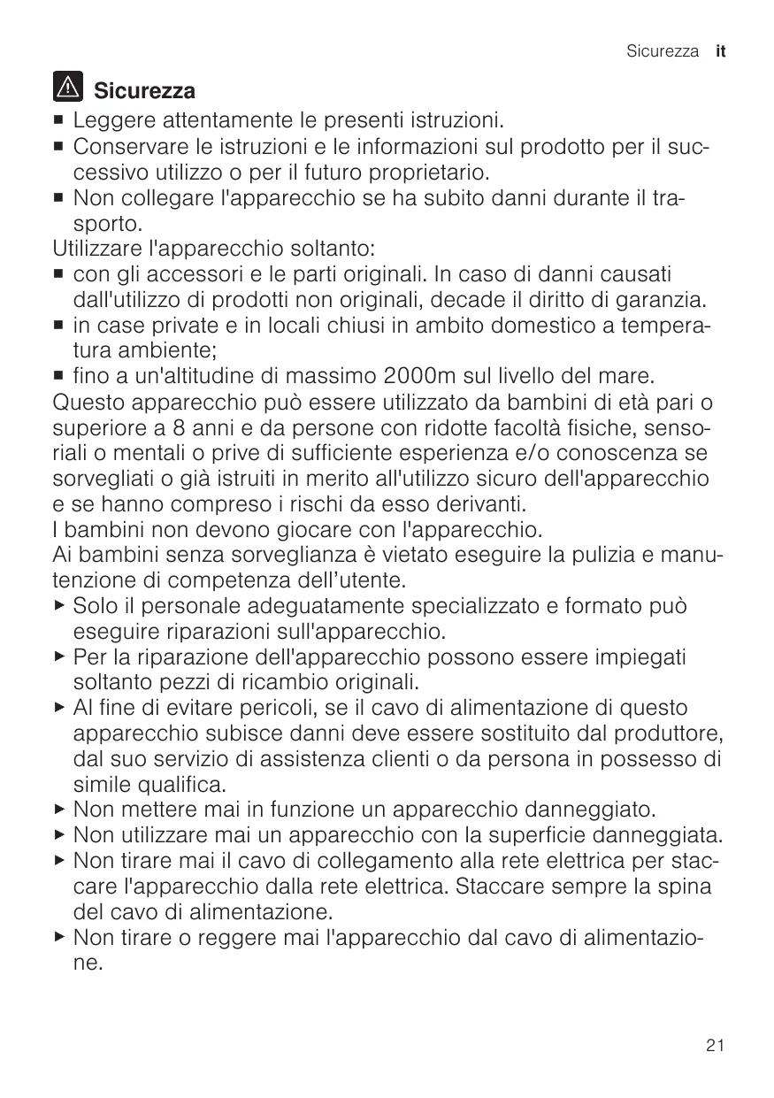 Questo apparecchio può essere utilizzato da bambini di età pari o superiore a 8 anni e da persone con ridotte facoltà fisiche, sensoriali o mentali o preve di sufficiente esperienza e/o conoscenza se sorvegliati o più astruiti in merito all'utilizzo sicuro dell'apparecchio e se hanno compreso i rischi daesso derivanti.