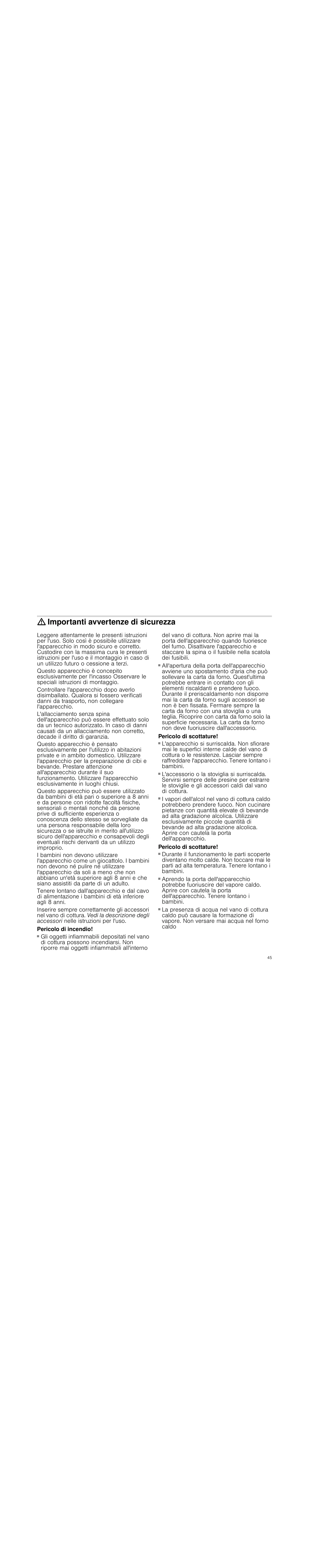 : Importanti avvertenze di sicurezza Leggere attentamente le presenti istruzioni per l'uso. Solo così è possibile utilizzare l'apparecchio in modo sicuro e corretto. Custodire con la massima cura le presenti istruzioni per l'uso e il montaggio in caso di un utilizzo futuro o cessione a terzi. Questo apparecchio è concepito esclusivamente per l'incasso Osservare le speciali istruzioni di montaggio. Controllare l'apparecchio dopo averlo disimballato. Qualora si fossero verificati danni da trasporto, non collegare l'apparecchio. L'allacciamento senza spina dell'apparecchio può essere effettuato solo da un tecnico autorizzato. In caso di danni causati da un allacciamento non corretto, decade il diritto di garanzia. Questo apparecchio è pensato esclusivamente per l'utilizzo in abitazioni private e in ambito domestico. Utilizzare l'apparecchio per la preparazione di cibi e bevande. Prestare attenzione all'apparecchio durante il suo funzionamento. Utilizzare l'apparecchio esclusivamente in luoghi chiusi. Questo apparecchio può essere utilizzato da bambini di età pari o superiore a 8 anni e da persone con ridotte facoltà fisiche, sensoriali o mentali nonché da persone prive di sufficiente esperienza o conoscenza dello stesso se sorvegliate da una persona responsabile della loro sicurezza o se istruite in merito all'utilizzo sicuro dell'apparecchio e consapevoli degli eventuali rischi derivanti da un utilizzo improprio. I bambini non devono utilizzare l'apparecchio come un giocattolo. I bambini non devono né pulire né utilizzare l'apparecchio da soli a meno che non abbiano un'età superiore agli 8 anni e che siano assistiti da parte di un adulto. Tenere lontano dall'apparecchio e dal cavo di alimentazione i bambini di età inferiore agli 8 anni. Inserire sempre correttamente gli accessori nel vano di cottura. Vedi la descrizione degli accessori nelle istruzioni per l'uso. Pericolo di incendio! ■ Gli oggetti infiammabili depositati nel vano di cottura possono incendiarsi. Non riporre mai oggetti infiammabili all'interno del vano di cottura. Non aprire mai la porta dell'apparecchio quando fuoriesce del fumo. Disattivare l'apparecchio e staccare la spina o il fusibile nella scatola dei fusibili. ■ All'apertura della porta dell'apparecchio avviene uno spostamento d'aria che può sollevare la carta da forno. Quest'ultima potrebbe entrare in contatto con gli elementi riscaldanti e prendere fuoco. Durante il preriscaldamento non disporre mai la carta da forno sugli accessori se non è ben fissata. Fermare sempre la carta da forno con una stoviglia o una teglia. Ricoprire con carta da forno solo la superficie necessaria. La carta da forno non deve fuoriuscire dall'accessorio. Pericolo di scottature! ■ L'apparecchio si surriscalda. Non sfiorare mai le superfici interne calde del vano di cottura o le resistenze. Lasciar sempre raffreddare l'apparecchio. Tenere lontano i bambini. ■ L'accessorio o la stoviglia si surriscalda. Servirsi sempre delle presine per estrarre le stoviglie e gli accessori caldi dal vano di cottura. ■ I vapori dell'alcol nel vano di cottura caldo potrebbero prendere fuoco. Non cucinare pietanze con quantità elevate di bevande ad alta gradazione alcolica. Utilizzare esclusivamente piccole quantità di bevande ad alta gradazione alcolica. Aprire con cautela la porta dell'apparecchio. Pericolo di scottature! ■ Durante il funzionamento le parti scoperte diventano molto calde. Non toccare mai le parti ad alta temperatura. Tenere lontano i bambini. ■ Aprendo la porta dell'apparecchio potrebbe fuoriuscire del vapore caldo. Aprire con cautela la porta dell'apparecchio. Tenere lontano i bambini. ■ La presenza di acqua nel vano di cottura caldo può causare la formazione di vapore. Non versare mai acqua nel forno caldo Pericolo di in cendio! Pericolo di scottature! Pericolo di scottature! Pericolo di bruciature! Pericolo di bruciature!