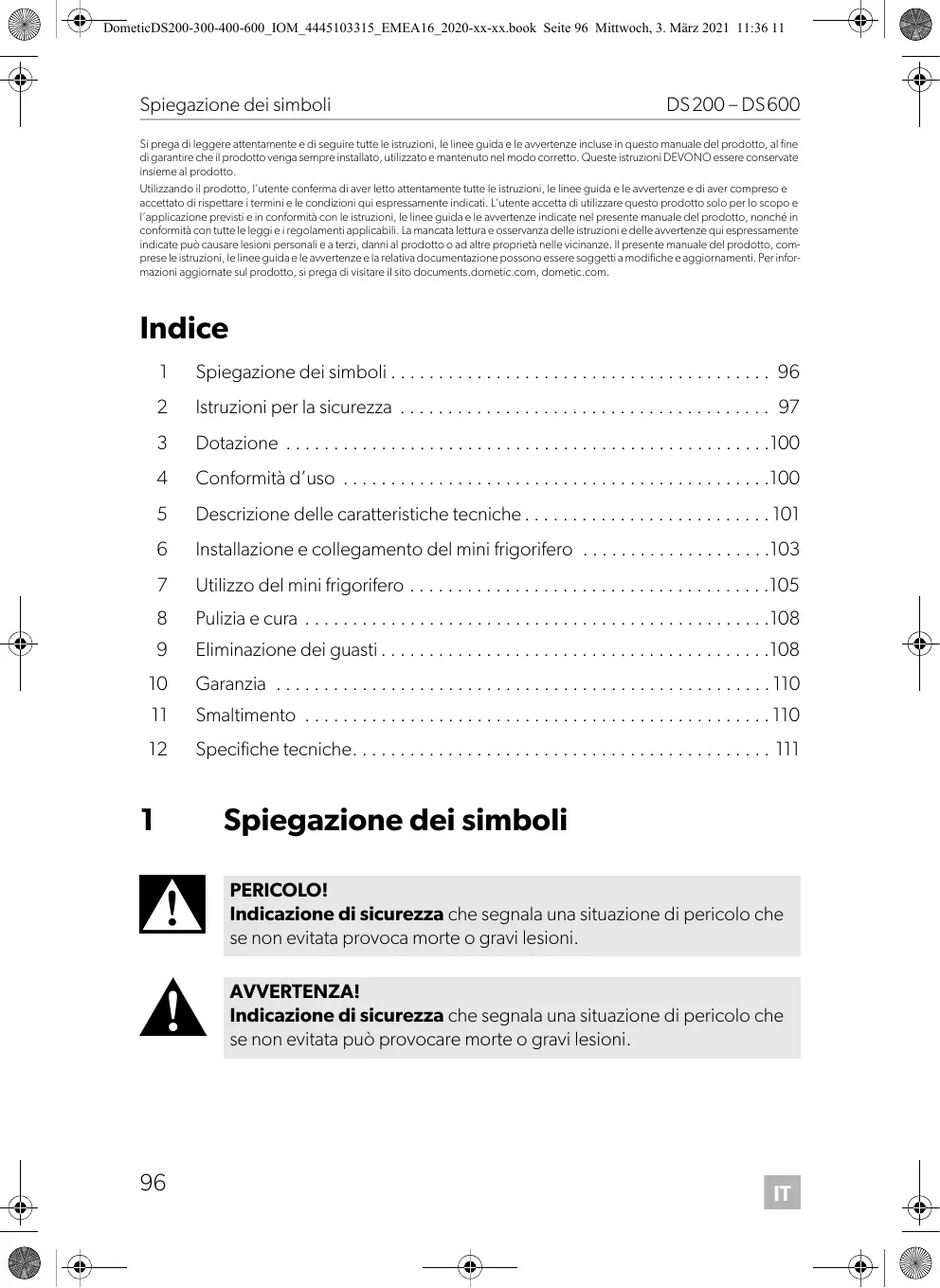 Si prega di leggere attentamente e di seguire tutte le istruzioni, le linee guida e le avvertenze incluse in questo manuale del prodotto, al fine di garantire che il prodotto venga sempre installato, utilizzato e mantenuto nel modo corretto. Queste istruzioni DEVONO essere conservate insieme al prodotto. Utilizzando il prodotto, l’utente conferma di aver letto attentamente tutte le istruzioni, le linee guida e le avvertenze e di aver compreso e accettato di rispettare i termini e le condizioni qui espressamente indicati. L’utente accetta di utilizzare questo prodotto solo per lo scopo e l’applicazione previsti e in conformità con le istruzioni, le linee guida e le avvertenze indicate nel presente manuale del prodotto, nonché in conformità con tutte le leggi e i regolamenti applicabili. La mancata lettura e osservanza delle istruzioni e delle avvertenze qui espressamente indicate può causare lesioni personali e a terzi, danni al prodotto o ad altre proprietà nelle vicinanze. Il presente manuale del prodotto, comprese le istruzioni, le linee guida e le avvertenze e la relativa documentazione possono essere soggetti a modifiche e aggiornamenti. Per informazioni aggiornate sul prodotto, si prega di visitare il sito documents.dometic.com, dometic.com.