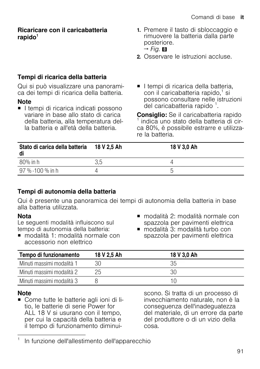 ¡ Mode 2 : mode normal avec une Les modes suivants affectent brosse électrique pour sols l'autonomie de la batterie : ¡ Mode 3 : mode turbo avec une ¡ Mode 1 : mode normal avec un brosse électrique pour sols accessoire non électrique Durée de marche Mode 1 jusqu'à min Mode 2 jusqu'à min Mode 3 jusqu'à min – Ne stockez pas la batterie pendant une période de temps prolongée alors qu'elle est entièrement chargée ou complètement déchargée.