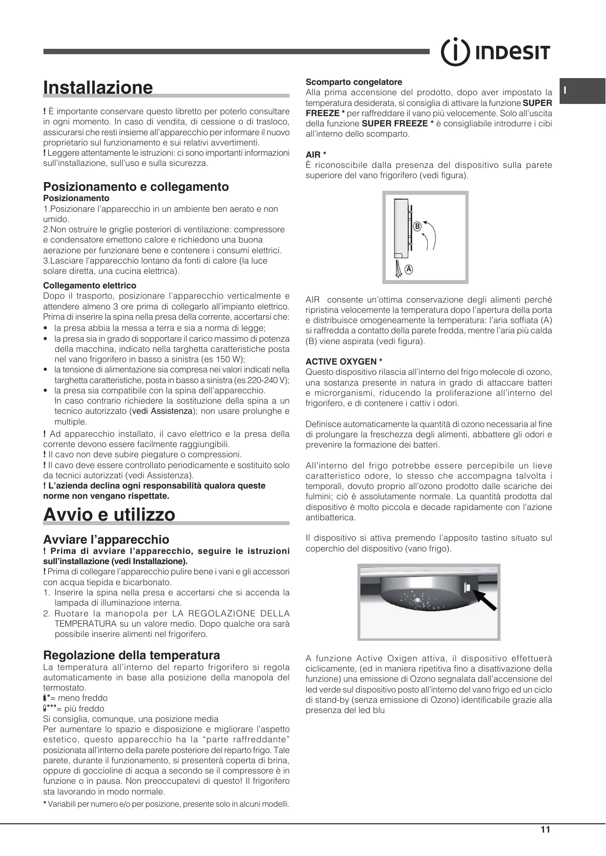 Lorsque la fonction Active Oxigen est activée, l’appareil effectue cycliquement (et de façon répétitive jusqu’à la désactivation de la fonction) une émission d’Ozone indiquée par l’allumage de la led verte sur le dispositif situé à l’intérieur du compartiment réfrigérateur, et un cycle de « stand-by » (sans émission d’Ozone) identifiable grâce à la présence de la led bleue.