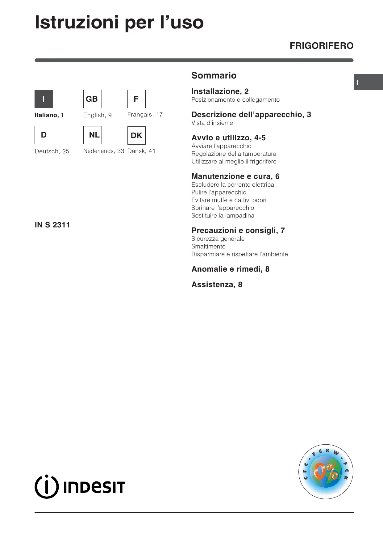 MANUALE UTENTE IN S 2312 F077264 INDESIT