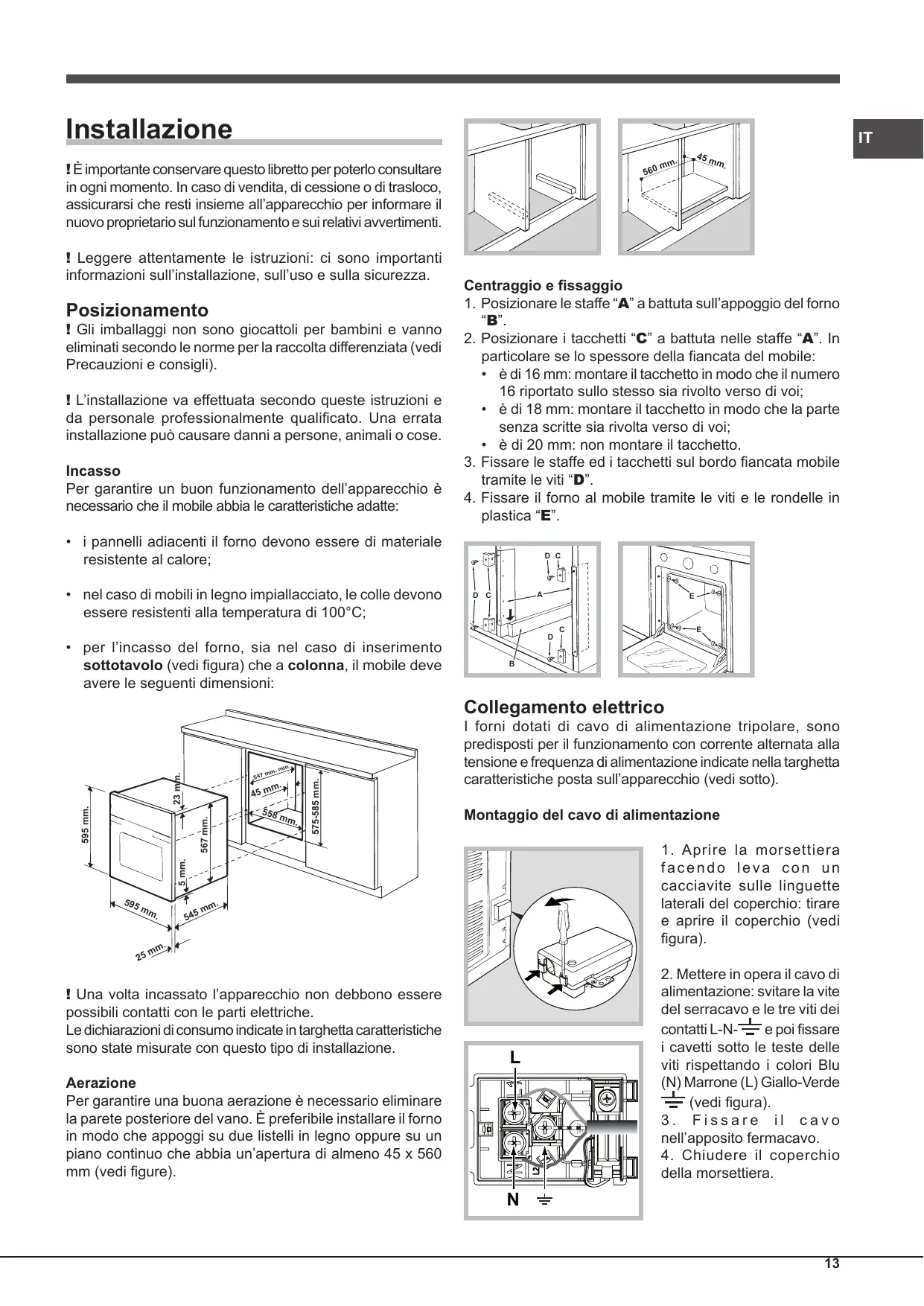 ! È importante conservare questo libretto per poterlo consultare in ogni momento. In caso di vendita, di cessione o di trasloco, assicurarsi che resti insieme all’apparecchio per informare il nuovo proprietario sul funzionamento e sui relativi avvertimenti. ! Leggere attentamente le istruzioni: ci sono importanti informazioni sull’installazione, sull’uso e sulla sicurezza. Posizionamento ! Gli imballaggi non sono giocattoli per bambini e vanno eliminati secondo le norme per la raccolta differenziata (vedi Precauzioni e consigli). ! L’installazione va effettuata secondo queste istruzioni e da personale professionalmente qualificato. Una errata installazione può causare danni a persone, animali o cose. Incasso Per garantire un buon funzionamento dell’apparecchio è necessario che il mobile abbia le caratteristiche adatte: