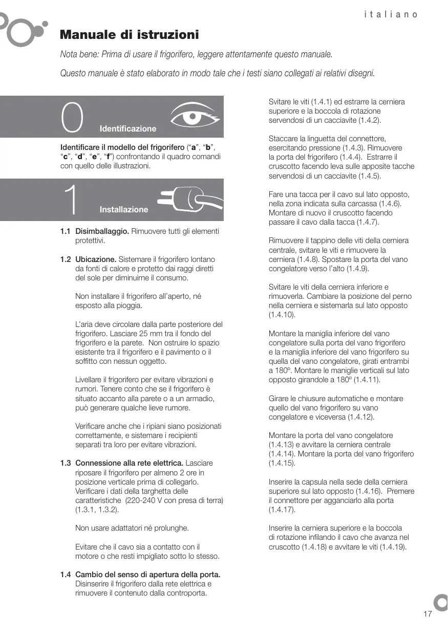 Draai de schroeven van de onderste scharnier los en verwijder die. Verander de positie van de as op de scharnier en plaats die aan de tegenovergestelde zijde (1.4.10) Plaats, 180° gedraaid, de onderste greep van de vriezer op de deur van de koelkast en plaats de onderste greep van de koelkast op die van de vriezer. Plaats de verticale handgrepen aan de tegenovergestelde zijden en draai die 180° (1.4.11). Draai de mechanismen voor automatisch sluiten en plaats die van de koelkast op de vriezer en vice versa (1.4.12). Plaats de deur van de vriezer (1.4.15) en de schroef de middelste scharnier vast (1.4.14). Plaats de deur van de koelkast (1.4.15). Plaats het afdichtkapje in de ruimte van de bovenste scharnier aan de tegenovergestelde zijde (1.4.16). Druk op het stekkertje om dat aan te sluiten op de deur (1.4.17).