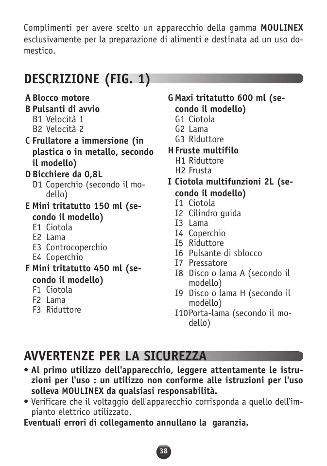 Complimenti per avere scelto un apparecchio della gamma MOULINEX esclusivamente per la preparazione di alimenti e destinata ad un uso domestico. DESCRIZIONE (FIG. 1) A Blocco motore B Pulsanti di avvio B1 Velocità 1 B2 Velocità 2 C Frullatore a immersione (in plastica o in metallo, secondo il modello) D Bicchiere da 0,8L D1 Coperchio (secondo il modello) E Mini tritatutto 150 ml (secondo il modello) E1 Ciotola E2 Lama E3 Controcoperchio E4 Coperchio F Mini tritatutto 450 ml (secondo il modello) F1 Ciotola F2 Lama F3 Riduttore G Maxi tritatutto 600 ml (secondo il modello) G1 Ciotola G2 Lama G3 Riduttore H Fruste multifilo H1 Riduttore H2 Frusta I Ciotola multifunzioni 2L (secondo il modello) I1 Ciotola I2 Cilindro guida I3 Lama I4 Coperchio I5 Riduttore I6 Pulsante di sblocco I7 Pressatore I8 Disco o lama A (secondo il modello) I9 Disco o lama H (secondo il modello) I10Porta-lama (secondo il modello)