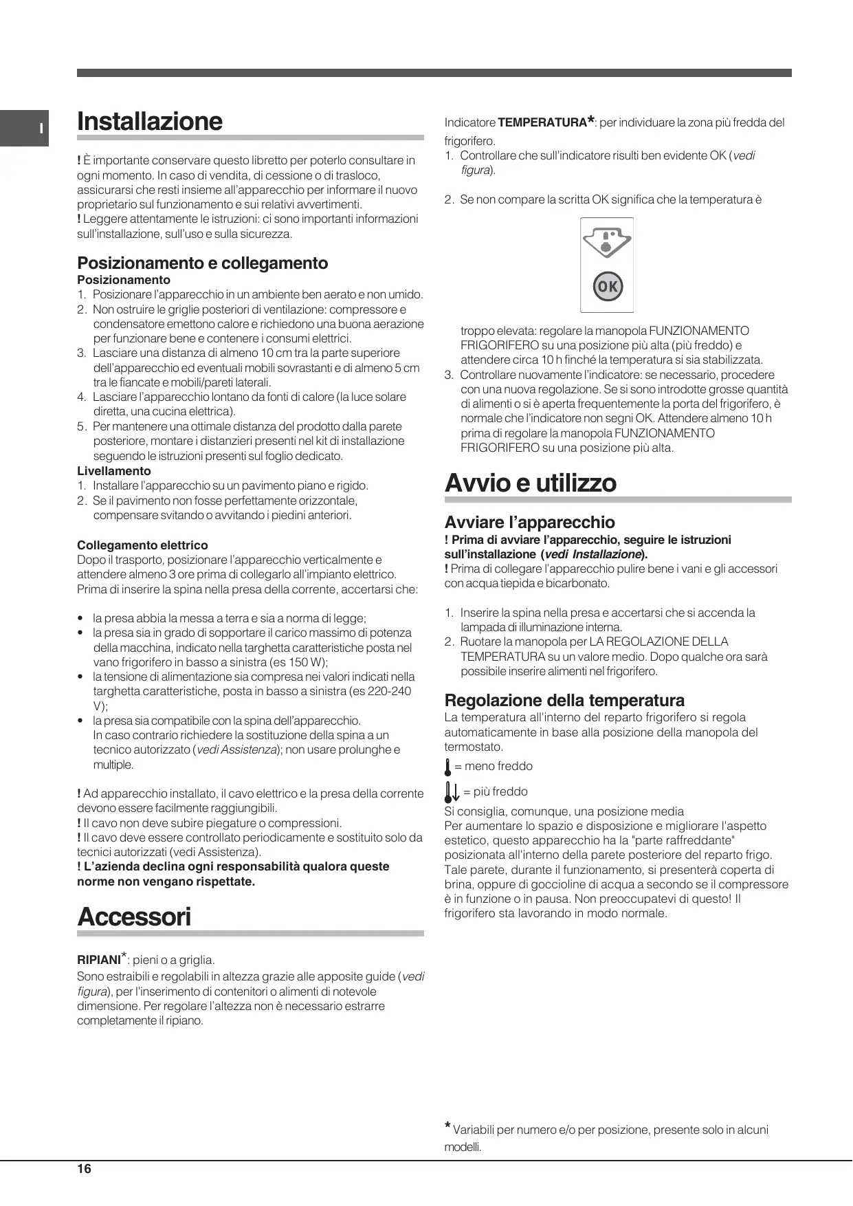 TEMPERATURA su un valore medio. Dopo qualche ora sarà possibile inserire alimenti nel frigorifero. ! Ad apparecchio installato, il cavo elettrico e la presa della corrente devono essere facilmente raggiungibili. ! Il cavo non deve subire piegature o compressioni. ! Il cavo deve essere controllato periodicamente e sostituito solo da tecnici autorizzati (vedi Assistenza). ! L’azienda declina ogni responsabilità qualora queste norme non vengano rispettate. Accessori Regolazione della temperatura La temperatura all'interno del reparto frigorifero si regola automaticamente in base alla posizione della manopola del termostato. = meno freddo = più freddo Si consiglia, comunque, una posizione media Per aumentare lo spazio e disposizione e migliorare l'aspetto estetico, questo apparecchio ha la "parte raffreddante" posizionata all'interno della parete posteriore del reparto frigo. Tale parete, durante il funzionamento, si presenterà coperta di brina, oppure di goccioline di acqua a secondo se il compressore è in funzione o in pausa. Non preoccupatevi di questo! Il frigorifero sta lavorando in modo normale. RIPIANI*: pieni o a griglia. Sono estraibili e regolabili in altezza grazie alle apposite guide (vedi figura), per l’inserimento di contenitori o alimenti di notevole dimensione. Per regolare l’altezza non è necessario estrarre completamente il ripiano.