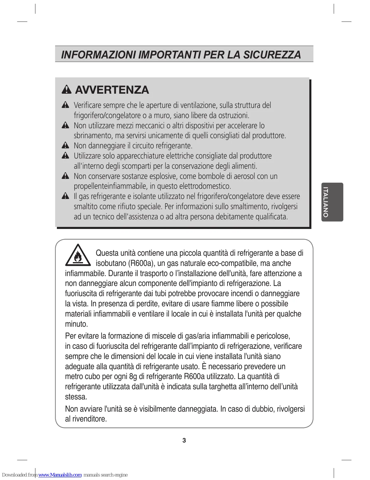 ITALIANO Quando vi sono fuoriuscite di gas, non toccare il frigorifero o l'uscita e ventilare immediatamente la stanza. • Un'esplosione provocata da una scintilla può provocare incendio o scottature. • Poiché il frigorifero fa uso di gas naturale (isobutene, R600a) come refrigerante rispettoso dell'ambiente, anche una piccola quantità è infiammabile (80~90g). Se vi sono fuoriuscite di gas a causa di gravi danni durante la consegna, l'installazione e uso del frigorifero può provocare scintille e incendio.