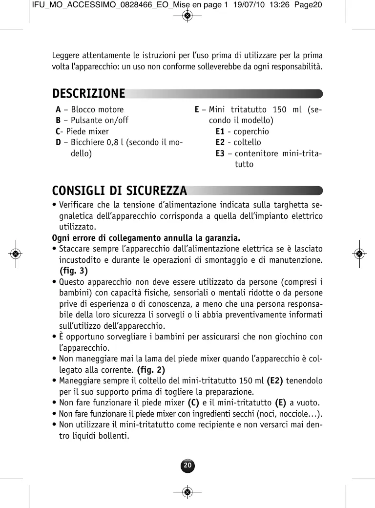 Cualquier error de conexión anularía la garantía. • Desconecte siempre su aparato si lo deja sin vigilancia, cuando lo desmonta o durante su mantenimiento. (fig.3) • Este aparato no está previsto para ser utilizado por personas (incluido los niños) cuyas capacidades físicas, sensoriales o mentales son reducidas, o por personas privadas de experiencia o de conocimiento, excepto si pudieran beneficiarse, por medio de otra persona responsable de su seguridad, de una vigilancia o de instrucciones previas concernientes a la utilización del aparato. • Conviene vigilar a los niños para asegurarse que no jueguen con el aparato. • Nunca manipule la cuchilla del pie mezclador si el aparato está enchufado. (fig.2) • Manipule siempre la cuchilla de la mini-picadora 150 ml (E2) por su base antes de tomar su preparación. • Nunca haga funcionar el pie mezclador (C) y la mini-picadora (E) en vacío. • Nunca haga funcionar el pie mezclador con ingredientes secos ( nueces, avellanas...). • No utilice la mini-picadora como recipiente y nunca vierta líquidos hirviendo en su interior. • Introduzca el pie de la batidora en la preparación, sumerja sólo la campana, ponga el aparato en marcha y deje que se vaya haciendo la preparación. • No es necesario machacar la preparación para obtener un buen resultado.