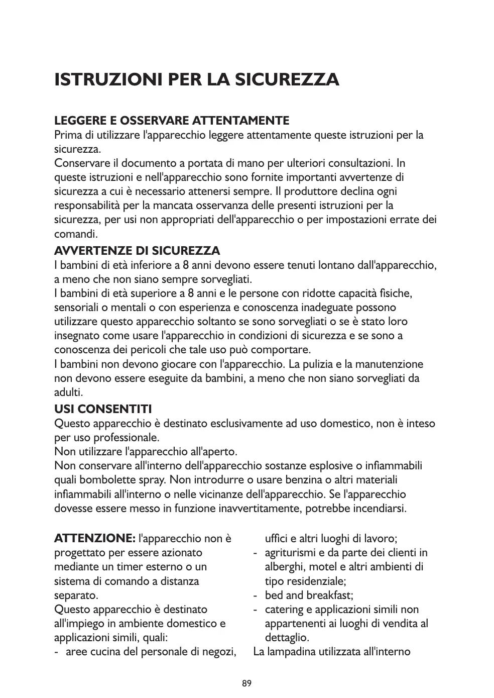 Les conserver à portée de main pour toute référence future. Les mises en garde contenues dans ces consignes de sécurité et sur l'appareil doivent toujours être respectées. Le fabricant décline toute responsabilité en cas de non-respect de ces consignes de sécurité, d'utilisation incorrecte de l'appareil ou de mauvais réglage des commandes. MISES EN GARDE Tenez les nourrissons (0-3 ans) et les jeunes enfants (3-8 ans) éloignés de l'appareil sauf en les tenant sous constante surveillance. Les enfants de 8 ans et plus ainsi que les personnes présentant des capacités physiques, sensorielles ou mentales réduites, ou ne possédant ni l'expérience ni les connaissances requises, peuvent utiliser cet appareil sous la surveillance ou les instructions d'une personne responsable leur ayant expliqué l'utilisation de l'appareil en toute sécurité, ainsi que les dangers potentiels. Ne laissez pas les enfants jouer avec l'appareil. Ne laissez pas les enfants nettoyer et procéder à l'entretien de l'appareil sans surveillance. EMPLOI AUTORISÉ Cet appareil est prévu pour un usage domestique et non professionnel. N'utilisez jamais l'appareil à l'extérieur. Ne stockez pas de substances explosives ou inflammables, comme des aérosols, et ne placez pas ou n'utiliser d'essence ou d'autres produits inflammables à proximité de l'appareil : un incendie pourrait se déclarer en cas de mise sous tension de l'appareil. ATTENTION ! L'appareil n'est pas prévu pour une utilisation au moyen d'une minuterie extérieure ou d'un système contrôlé à distance. Cet appareil a été conçu à des fins domestiques et pour des applications similaires, telles que : - cuisines pour le personnel de boutiques, bureaux et autres lieux de travail ; - gîtes et clients d'hôtels, de motels ou d'autres types d'hébergements ;