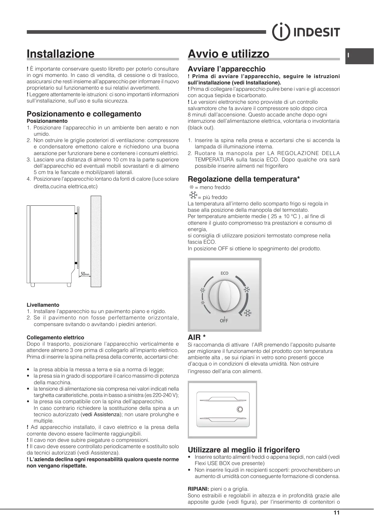 Si raccomanda di attivare l’AIR premendo l’apposito pulsante per migliorare il funzionamento del prodotto con temperatura ambiente alta , se sui ripiani in vetro sono presenti gocce d’acqua o in condizioni di elevata umidità. Non ostruire l’ingresso dell’aria con alimenti.