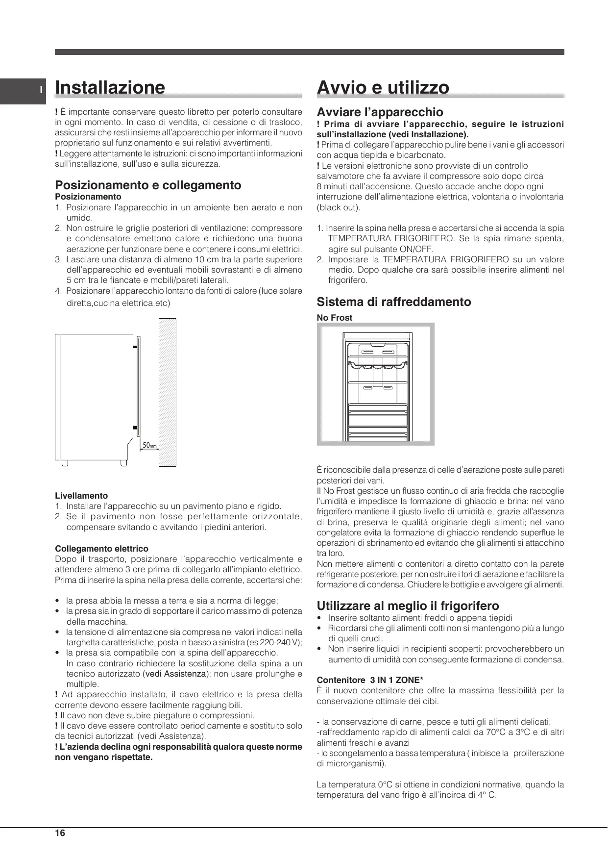 È riconoscibile dalla presenza di celle d’aerazione poste sulle pareti posteriori dei vani. Il No Frost gestisce un flusso continuo di aria fredda che raccoglie l’umidità e impedisce la formazione di ghiaccio e brina: nel vano frigorifero mantiene il giusto livello di umidità e, grazie all’assenza di brina, preserva le qualità originarie degli alimenti; nel vano congelatore evita la formazione di ghiaccio rendendo superflue le operazioni di sbrinamento ed evitando che gli alimenti si attacchino tra loro. Non mettere alimenti o contenitori a diretto contatto con la parete refrigerante posteriore, per non ostruire i fori di aerazione e facilitare la formazione di condensa. Chiudere le bottiglie e avvolgere gli alimenti.