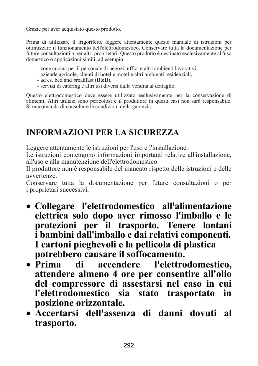 - dans les exploitations agricoles, pour la clientèle des hôtels, motels et autres environnements de type résidentiel - dans les hébergements Bed and Breakfast (B & B) - pour les services de restauration et des applications similaires non destinées à une vente au détail. Cet appareil doit être utilisé uniquement à des fins de conservation d'aliments, toute autre utilisation est considérée comme dangereuse et le fabricant ne sera pas responsable de toute omission. De plus, il est recommandé de prendre note des conditions de garantie.