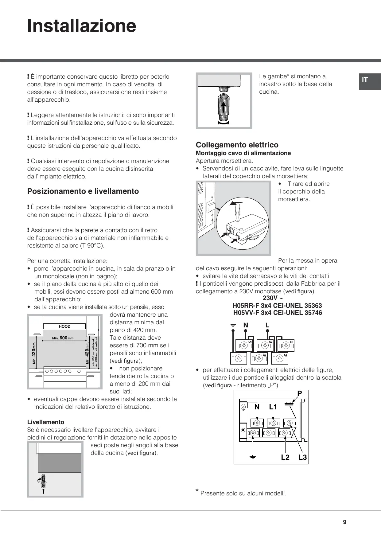 • installer cet appareil dans une cuisine, une salle à manger ou un studio (jamais dans une salle de bains) ; • si le plan de cuisson de la cuisinière dépasse le plan de travail des meubles, ces derniers doivent être placés à au moins 200 mm de l’appareil. • si la cuisinière est installée sous un élément HOOD suspendu, il faut que Min. 600 mm. ce dernier soit placé à au moins 420 mm de distance du plan. Il faut prévoir une distance de 700 mm si les éléments suspendus sont inflammables (voir figure) ; • ne pas placer de rideaux derrière ou sur les côtés de la cuisinière à moins de 200 mm de distance. • pour l’installation de hottes, se conformer aux instructions de leur notice d’emploi. Min.