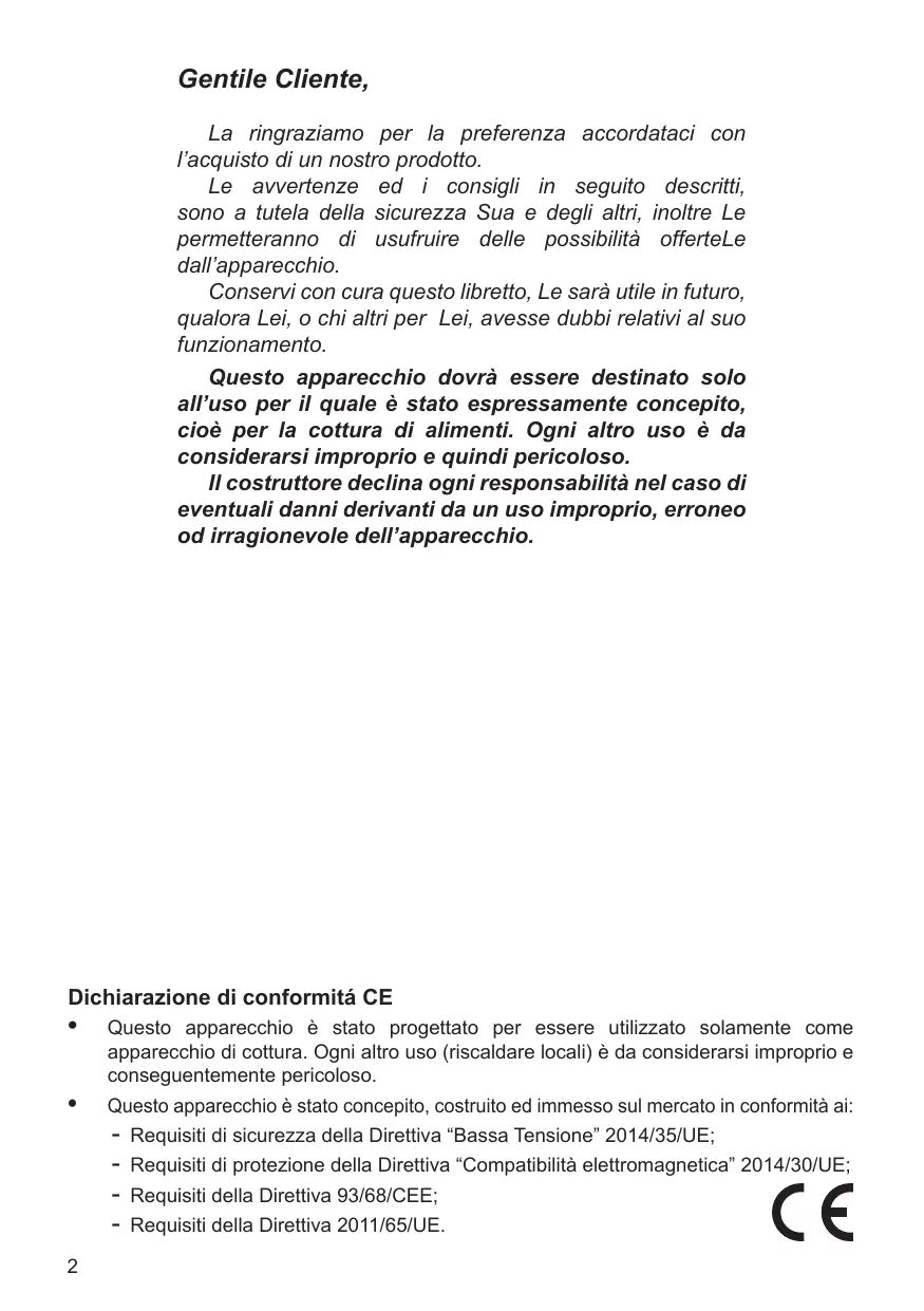 Questo apparecchio è stato progettato per essere utilizzato solamente come apparecchio di cottura. Ogni altro uso (riscaldare locali) è da considerarsi improprio e conseguentemente pericoloso. Questo apparecchio è stato concepito, costruito ed immesso sul mercato in conformità ai: -- Requisiti di sicurezza della Direttiva “Bassa Tensione” 2014/35/UE; -- Requisiti di protezione della Direttiva “Compatibilità elettromagnetica” 2014/30/UE; -- Requisiti della Direttiva 93/68/CEE; -- Requisiti della Direttiva 2011/65/UE. AVVERTENZE E CONSIGLI IMPORTANTI PER LA SICUREZZA IMPORTANTE: Questo apparecchio è stato progettato e costruito solo per la cottura di alimenti in ambito domestico e pertanto non deve essere utilizzato in un ambiente commerciale. La garanzia è da intendersi annullata nel caso in cui l’apparecchio venga utilizzato in un ambiente comunale, semi-commerciale o commerciale. Leggere attentamente le istruzioni prima di installare ed iniziare ad utilizzare l’apparecchio.