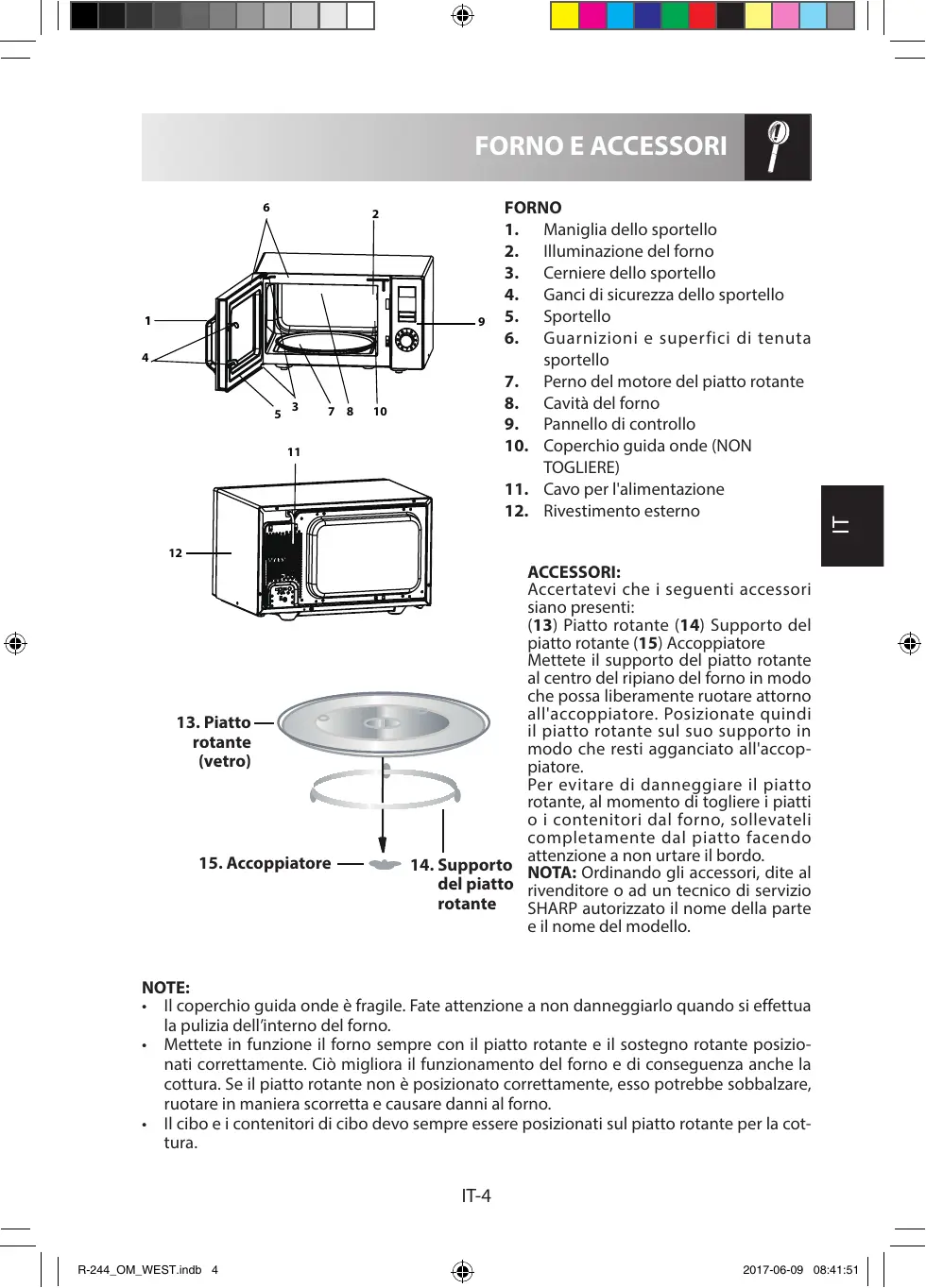 - Il cibo e i contenitori di cibo devo sempre essere posizionati sul piatto rotante per la cottura. IT-4 R-244_OM_WEST.indb 4 2017-06-09 08:41:51