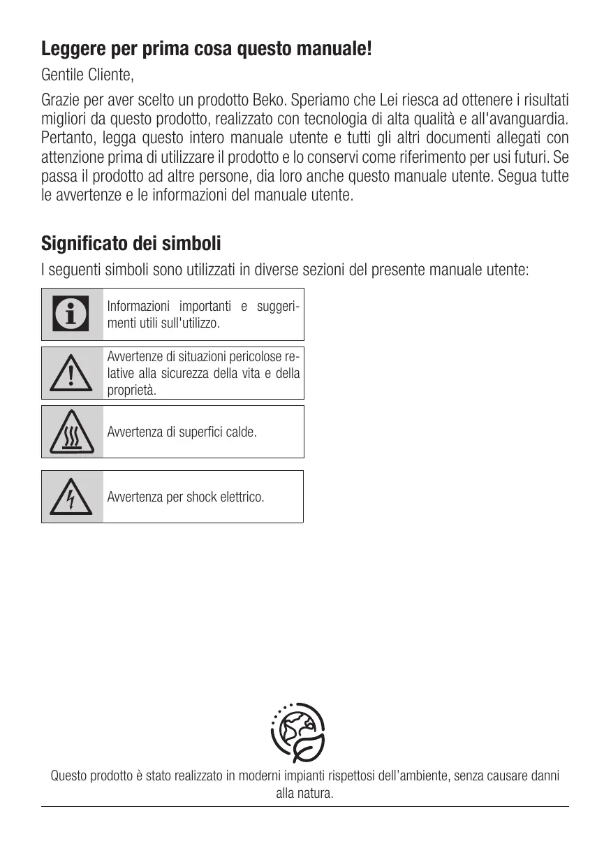 oven is dirty. Refer to “Cleaning and Maintenance" section to clean dirty parts. Microwave Oven / User Manual 19 / EN Leggere per prima cosa questo manuale! Gentile Cliente, Grazie per aver scelto un prodotto Beko. Speriamo che Lei riesca ad ottenere i risultati migliori da questo prodotto, realizzato con tecnologia di alta qualità e all'avanguardia. Pertanto, legga questo intero manuale utente e tutti gli altri documenti allegati con attenzione prima di utilizzare il prodotto e lo conservi come riferimento per usi futuri. Se passa il prodotto ad altre persone, dia loro anche questo manuale utente. Segua tutte le avvertenze e le informazioni del manuale utente. Significato dei simboli I seguenti simboli sono utilizzati in diverse sezioni del presente manuale utente: