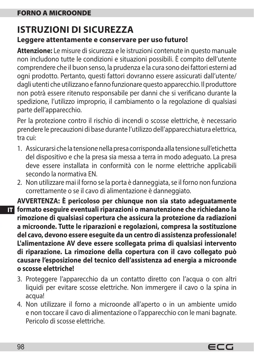 Utilizzare il forno a microonde solo in conformità alle istruzioni di questo manuale. Questo forno a microonde è stato progettato ad uso esclusivamente domestico. Il produttore non è responsable per danni causati da un uso improprio di questo apparecchio.
