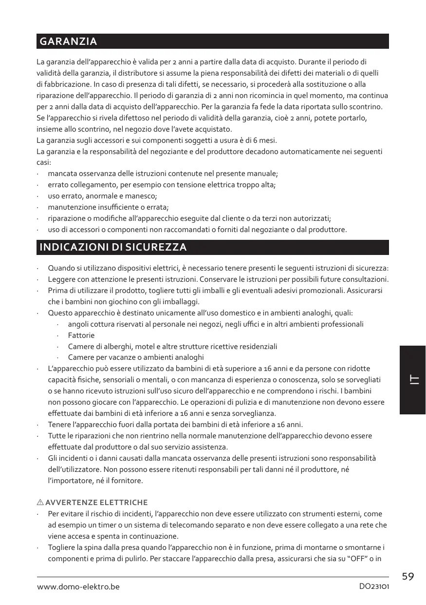 DO23101 GARANZIA La garanzia dell’apparecchio è valida per 2 anni a partire dalla data di acquisto. Durante il periodo di validità della garanzia, il distributore si assume la piena responsabilità dei difetti dei materiali o di quelli di fabbricazione. In caso di presenza di tali difetti, se necessario, si procederà alla sostituzione o alla riparazione dell’apparecchio. Il periodo di garanzia di 2 anni non ricomincia in quel momento, ma continua per 2 anni dalla data di acquisto dell’apparecchio. Per la garanzia fa fede la data riportata sullo scontrino. Se l’apparecchio si rivela difettoso nel periodo di validità della garanzia, cioè 2 anni, potete portarlo, insieme allo scontrino, nel negozio dove l’avete acquistato. La garanzia sugli accessori e sui componenti soggetti a usura è di 6 mesi. La garanzia e la responsabilità del negoziante e del produttore decadono automaticamente nei seguenti casi: