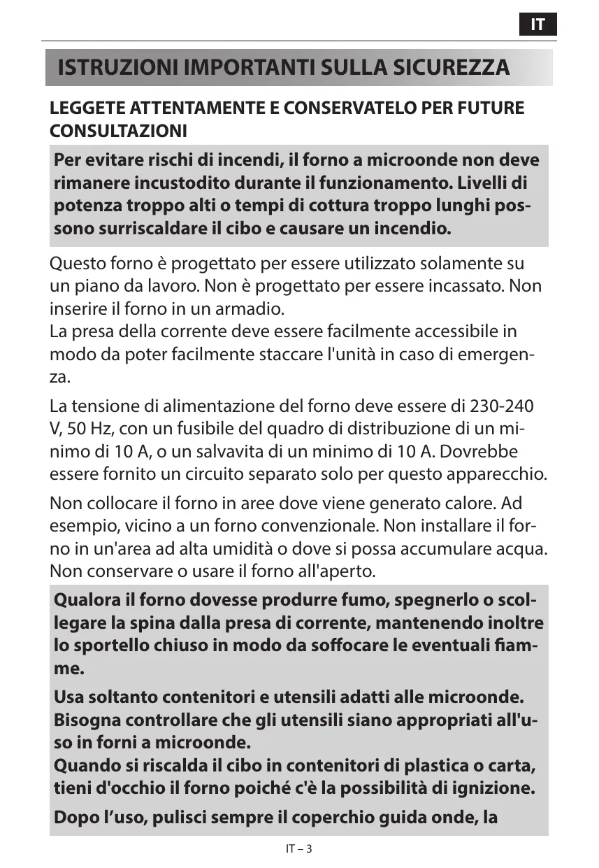 CONSULTAZIONI Per evitare rischi di incendi, il forno a microonde non deve rimanere incustodito durante il funzionamento. Livelli di potenza troppo alti o tempi di cottura troppo lunghi possono surriscaldare il cibo e causare un incendio. Questo forno è progettato per essere utilizzato solamente su un piano da lavoro. Non è progettato per essere incassato. Non inserire il forno in un armadio. La presa della corrente deve essere facilmente accessibile in modo da poter facilmente staccare l'unità in caso di emergenza. La tensione di alimentazione del forno deve essere di 230-240 V, 50 Hz, con un fusibile del quadro di distribuzione di un minimo di 10 A, o un salvavita di un minimo di 10 A. Dovrebbe essere fornito un circuito separato solo per questo apparecchio. Non collocare il forno in aree dove viene generato calore. Ad esempio, vicino a un forno convenzionale. Non installare il forno in un'area ad alta umidità o dove si possa accumulare acqua. Non conservare o usare il forno all'aperto. Qualora il forno dovesse produrre fumo, spegnerlo o scollegare la spina dalla presa di corrente, mantenendo inoltre lo sportello chiuso in modo da soffocare le eventuali fiamme. Usa soltanto contenitori e utensili adatti alle microonde. Bisogna controllare che gli utensili siano appropriati all'uso in forni a microonde. Quando si riscalda il cibo in contenitori di plastica o carta, tieni d'occhio il forno poiché c'è la possibilità di ignizione. Dopo l’uso, pulisci sempre il coperchio guida onde, la IT – 3 cavità del forno, il piatto rotante: devono essere asciutti e senza tracce di grasso. Gli accumuli di grasso possono surriscaldarsi, fumare o infiammarsi. Non mettere materiali infiammabili vicino al forno o alle aperture di ventilazione. Non ostruire le aperture di ventilazione. Rimuovi tutti i sigilli di metallo, chiusure in fil di ferro ecc. dal cibo e della confezioni. Gli archi elettrici sulle superfici metalliche potrebbero causare un incendio. Non usare il forno a microonde per scaldare l'olio per la frittura. La temperatura non può essere controllata e l'olio potrebbe infiammarsi. Per preparare i popcorn, usa soltanto prodotti per la preparazione dei popcorn destinati al microonde. Non conservare cibo od oggetti all’interno del forno. Controllare le impostazioni dopo aver avviato il forno, per accertarsi che esso funzioni nel modo desiderato. Non lasciare il forno senza supervisione mentre è in funzione. Per evitare surriscaldamento o incendio, prestare molta attenzione alla cottura o al riscaldamento di cibi che contengono molto zucchero o sostanze grasse, quali ad esempio salsicce, pasticci di carne o dolci. Leggi i suggerimenti corrispondenti nel manuale d'uso. Per evitare il rischio di lesioni. ATTENZIONE: Non usare il forno se è danneggiato o non funziona normalmente. Controllare quanto segue prima di continuare ad usarlo: a) Assicurarsi che lo sportello si chiuda correttamente e che non sia fuori sesto o deformato. b) Controllare per assicurarsi che i cardini e i blocchi di sicurezza dello sportello non siano rotti o allentati. IT – 4
