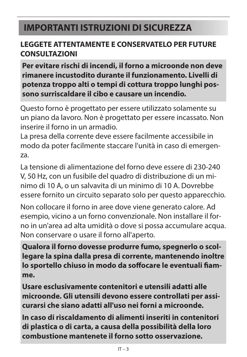 CONSULTAZIONI Per evitare rischi di incendi, il forno a microonde non deve rimanere incustodito durante il funzionamento. Livelli di potenza troppo alti o tempi di cottura troppo lunghi possono surriscaldare il cibo e causare un incendio. Questo forno è progettato per essere utilizzato solamente su un piano da lavoro. Non è progettato per essere incassato. Non inserire il forno in un armadio. La presa della corrente deve essere facilmente accessibile in modo da poter facilmente staccare l'unità in caso di emergenza. La tensione di alimentazione del forno deve essere di 230-240 V, 50 Hz, con un fusibile del quadro di distribuzione di un minimo di 10 A, o un salvavita di un minimo di 10 A. Dovrebbe essere fornito un circuito separato solo per questo apparecchio. Non collocare il forno in aree dove viene generato calore. Ad esempio, vicino a un forno convenzionale. Non installare il forno in un'area ad alta umidità o dove si possa accumulare acqua. Non conservare o usare il forno all'aperto. Qualora il forno dovesse produrre fumo, spegnerlo o scollegare la spina dalla presa di corrente, mantenendo inoltre lo sportello chiuso in modo da soffocare le eventuali fiamme. Usare esclusivamente contenitori e utensili adatti alle microonde. Gli utensili devono essere controllati per assicurarsi che siano adatti all'uso nei forni a microonde. In caso di riscaldamento di alimenti inseriti in contenitori di plastica o di carta, a causa della possibilità della loro combustione mantenete il forno sotto osservazione. IT – 3