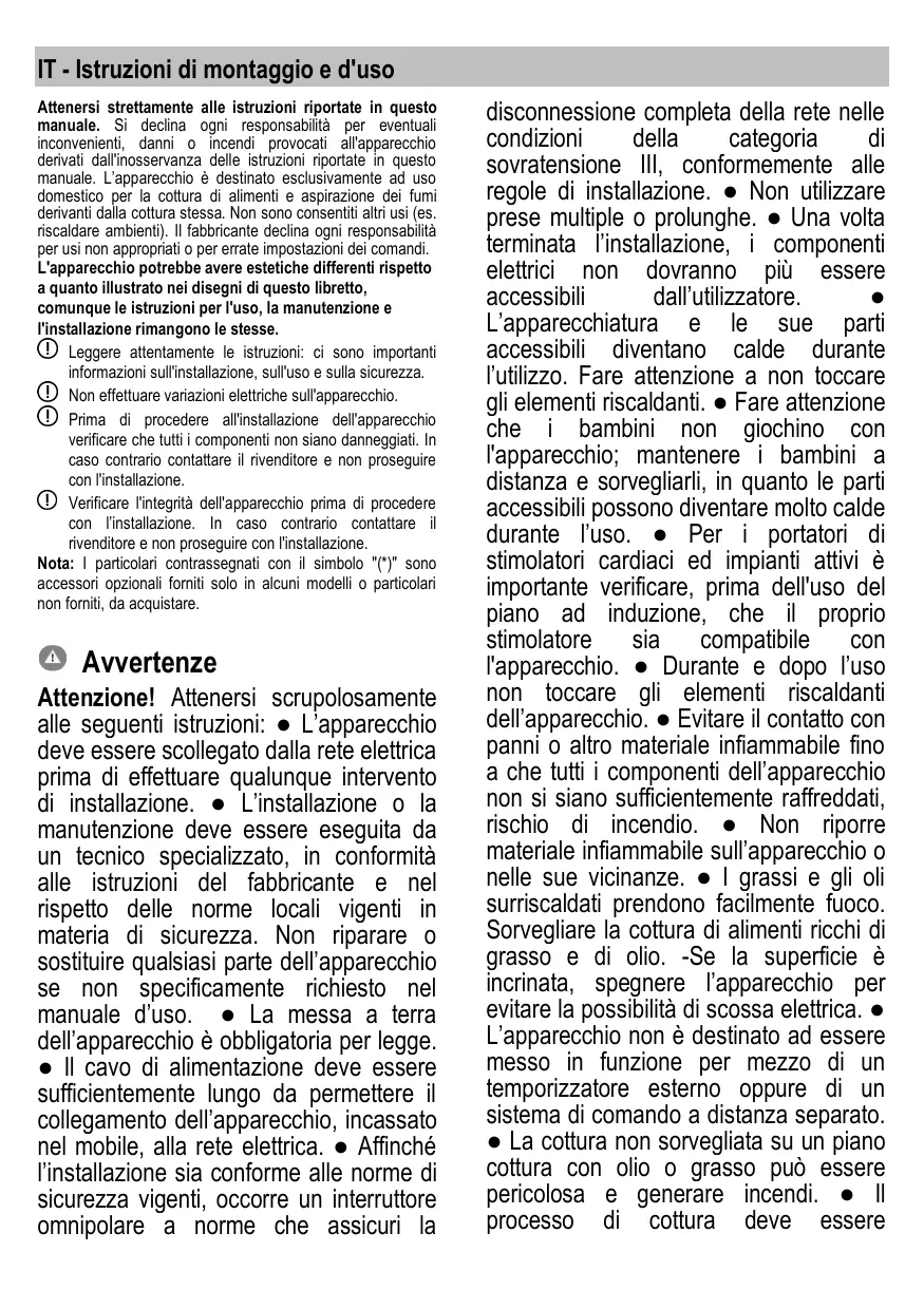 Nous déclinons toute responsabilité pour tout problème, dommage ou incendie causé à l'appareil suite au non-respect des instructions reportées dans ce manuel. L'appareil est destiné exclusivement à un usage domestique pour la cuisson des aliments et l'aspiration des fumées produites par la cuisson. Aucune autre utilisation n'est autorisée (par ex. chauffage de pièces). Le fabricant décline toute responsabilité en cas d’utilisation inappropriée ou de réglage erroné des commandes. L'appareil peut avoir un aspect différent par rapport au dessin de cette notice mais les instructions pour l'utilisation, l'entretien et l'installation restent les mêmes. Lire attentivement les instructions : elles contiennent des informations importantes sur l’installation, sur l’utilisation et sur la sécurité. Ne pas effectuer de modifications électriques sur l’appareil. Avant de procéder à l’installation de l’appareil, vérifier qu’aucun composant n’est endommagé. Sinon, contacter le revendeur et ne pas continuer l'installation. Vérifier l'état de l'appareil avant de procéder avec l’installation. Sinon, contacter le revendeur et ne pas continuer l'installation. Remarque : Les pièces marquées du symbole « (*) » sont des accessoires en option fournis uniquement avec certains modèles, ou des pièces non fournies, à acheter.