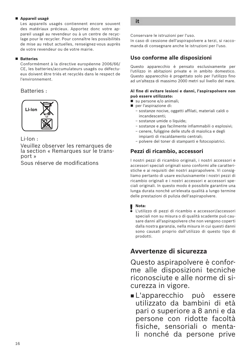 di sufficiente esperienza e/o conoscenza dello stes- so, se sorvegliate o istruite in merito all'utilizzo sicuro dell'apparecchio e consape- voli degli eventuali rischi de- rivanti da un utilizzo improp- rio. =! bambini non devono giocare con l'apparecchio nemmeno quando è appeso al supporto a muro. ms Ai bambini senza sorveglian- za è vietato eseguire la puli zia e la manutenzione di com- petenza dell’utente. Si raccomanda di tenere i sacchetti di plastica e la plas- tica da imballaggio fuori dalla portata dei bambini e di pro- vvedere al loro smaltimento. ->Pericolo di soffocamento! Uso conforme M Per il caricamento utilizzare esclusivamente il cavo di ricarica fornito in dotazione o il caricabatteria rapido originale. Collegare e mettere in funzione il cavo di carica e il caricabatteria rapido solo in conformità a quanto ri- portato sulla targhetta di identificazione. Depositare e caricare l'apparecchio solo in ambienti interni. Non esporre l'apparecchio a temperature inferiori a 0 °C e superiori a 45 °C. Non utilizzare mai l'aspirapolvere senza contenitore raccoglisporco e filtro di protezione del motore. => L'apparecchio puè subire danni! In fase di aspirazione, tenere la spazzola e il tubo a debita distanza dalla testa. => Pericolo di lesioni! Non impiegare più il cavo di carica se danneggiato e sostituirlo con un cavo di carica originale. Per staccare il cavo di carica dalla corrente elettrica non tirare il cavo di collegamento, ma la spina. Non fare passare il cavo di carica su spigoli vivi e non schiacciarlo. Prima di effettuare lavori sull'aspirapolvere, spegne- re l'apparecchio o staccarlo dal cavo di carica e dalla corrente elettrica. Non utilizzare l'aspirapolvere se danneggiato. In caso di anomalia, spegnere l'apparecchio o staccar- lo dal cavo di carica e dalla corrente elettrica. Per evitare situazioni di pericolo, gli interventi di riparazione e sostituzione dei pezzi di ricambio sull'aspirapolvere devono essere eseguiti esclusiva- mente da tecnici autorizzati del servizio di assistenza clienti. Nei seguenti casi, spegnere subito l'apparecchio e contattare il servizio di assistenza clienti - se à stato inawertitamente aspirato del liquido o se ë presente del liquido all'interno dell'apparecchio; - se l'apparecchio à caduto e si à danneggiato. Proteggere l'aspirapolvere dalle intemperie, dall'umidità e dalle sorgenti di calore. Non collocare mai sul filtro (sacchetto filtro, filtro di protezione del motore, filtro d'igiene, ecc.) sostanze infiammabili o contenenti alcol. L'aspirapolvere non è adatto alluso nei cantie- ri. =»L'aspirazione di macerie puè danneggiare l'apparecchio. Spegnere l'apparecchio se non lo si utilizza. L'apparecchio non sta in piedi da solo. Evitare di fare cadere l'apparecchio. Non appoggiare l'aspirapolvere alle pareti o ai bordi del tavolo. L'imballaggio protegge l'aspirapolvere da eventuali danni durante il trasporto. Consigliamo pertanto di conservare l'imballaggio per un eventuale trasporto. Accertarsi di non awvicinare troppo alle aperture ca- pelli, indumenti non attillati, dita o altre parti del cor- po e che questi non entrino in contatto con le parti mobili, come ad es. la spazzola. Non rivolgere mai né il tubo flessibile/tubo né l'ugello in direzione degli occhi o delle orecchie e non aspirare nulla dalla bocca. Battei ni d agl tio M Leggere completamente le awvertenze di sicurezza e le istruzioni. => La mancata osservanza delle awvertenze di sicu- rezza e delle istruzioni possono provocare scosse elettriche, incendi e/o gravi lesioni. Conservare le awertenze di sicurezza e le istruzioni per il futuro. Queste awertenze di sicurezza valgono soltanto per le batterie agli ioni di litio Bosch! Per questo appa- recchio sono adatte soltanto le batterie della serie “Power for ALL”. Non aprire la batteria. => Sussiste il pericolo di cortocircuito. Proteggere la batteria dal calore, ad esempio anche da un'esposizione solare continuativa, fuoco, acqua & umidità. => Sussiste pericolo d'esplosione. In caso di danni e utilizzo non conforme della batteria possono fuoriuscire vapori. Spostarsi alla ricerca di aria pulita e in caso di disturbi contattare un medico. => 1 vapori possono irritare le vie respiratorie. In caso di batteria difettosa, puë fuoriuscire del liqui- do e raggiungere gli oggetti circostanti. Controllare i componenti interessati. > Pulirli o eventualmente sostituirl Utilizzare la batteria soltanto all'elettrodomestico Bosch. => Solo in questo modo, la batteria viene protetta da un pericoloso sovraccarico. collegata