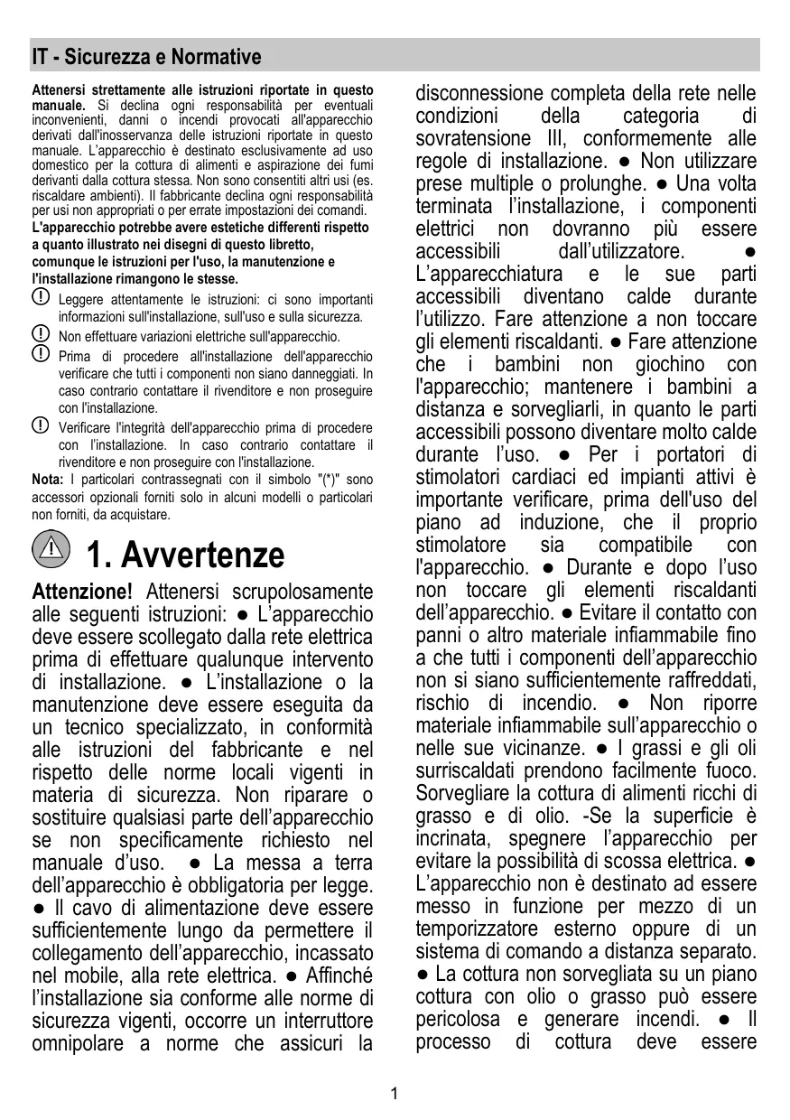 Istruzioni di montaggio e d'uso Instruction on mounting and use Montage- und Gebrauchsanweisung Prescriptions de montage et mode d’emploi Bruger- og monteringsvejledningija Asennus- ja käyttöohjeet Montagevoorschriften en gebruiksaanwijzingen Instrukser for montering og bruk Monterings- och bruksanvisningar IT - Sicurezza e Normative disconnessione completa della rete nelle condizioni della categoria sovratensione III, conformemente alle regole di installazione. ● Non utilizzare prese multiple o prolunghe. ● Una volta terminata l’installazione, i componenti elettrici non dovranno più essere accessibili dall’utilizzatore. L’apparecchiatura e le sue parti accessibili diventano calde durante l’utilizzo. Fare attenzione a non toccare gli elementi riscaldanti. ● Fare attenzione che i bambini non giochino con l'apparecchio; mantenere i bambini a distanza e sorvegliarli, in quanto le parti accessibili possono diventare molto calde durante l’uso. ● Per i portatori di stimolatori cardiaci ed impianti attivi è importante verificare, prima dell'uso del piano ad induzione, che il proprio stimolatore sia compatibile con l'apparecchio. ● Durante e dopo l’uso non toccare gli elementi riscaldanti dell’apparecchio. ● Evitare il contatto con panni o altro materiale infiammabile fino a che tutti i componenti dell’apparecchio non si siano sufficientemente raffreddati, rischio di incendio. ● Non riporre materiale infiammabile sull’apparecchio o nelle sue vicinanze. ● I grassi e gli oli surriscaldati prendono facilmente fuoco. Sorvegliare la cottura di alimenti ricchi di grasso e di olio. -Se la superficie è incrinata, spegnere l’apparecchio per evitare la possibilità di scossa elettrica. ● L’apparecchio non è destinato ad essere messo in funzione per mezzo di un temporizzatore esterno oppure di un sistema di comando a distanza separato. ● La cottura non sorvegliata su un piano cottura con olio o grasso può essere pericolosa e generare incendi. ● Il processo di cottura deve essere Attenersi strettamente alle istruzioni riportate in questo manuale. Si declina ogni responsabilità per eventuali inconvenienti, danni o incendi provocati all'apparecchio derivati dall'inosservanza delle istruzioni riportate in questo manuale. L’apparecchio è destinato esclusivamente ad uso domestico per la cottura di alimenti e aspirazione dei fumi derivanti dalla cottura stessa. Non sono consentiti altri usi (es. riscaldare ambienti). Il fabbricante declina ogni responsabilità per usi non appropriati o per errate impostazioni dei comandi. L'apparecchio potrebbe avere estetiche differenti rispetto a quanto illustrato nei disegni di questo libretto, comunque le istruzioni per l'uso, la manutenzione e l'installazione rimangono le stesse. Leggere attentamente le istruzioni: ci sono importanti informazioni sull'installazione, sull'uso e sulla sicurezza. Non effettuare variazioni elettriche sull'apparecchio. Prima di procedere all'installazione dell'apparecchio verificare che tutti i componenti non siano danneggiati. In caso contrario contattare il rivenditore e non proseguire con l'installazione. Verificare l'integrità dell'apparecchio prima di procedere con l’installazione. In caso contrario contattare il rivenditore e non proseguire con l'installazione. Nota: I particolari contrassegnati con il simbolo "(*)" sono accessori opzionali forniti solo in alcuni modelli o particolari non forniti, da acquistare.