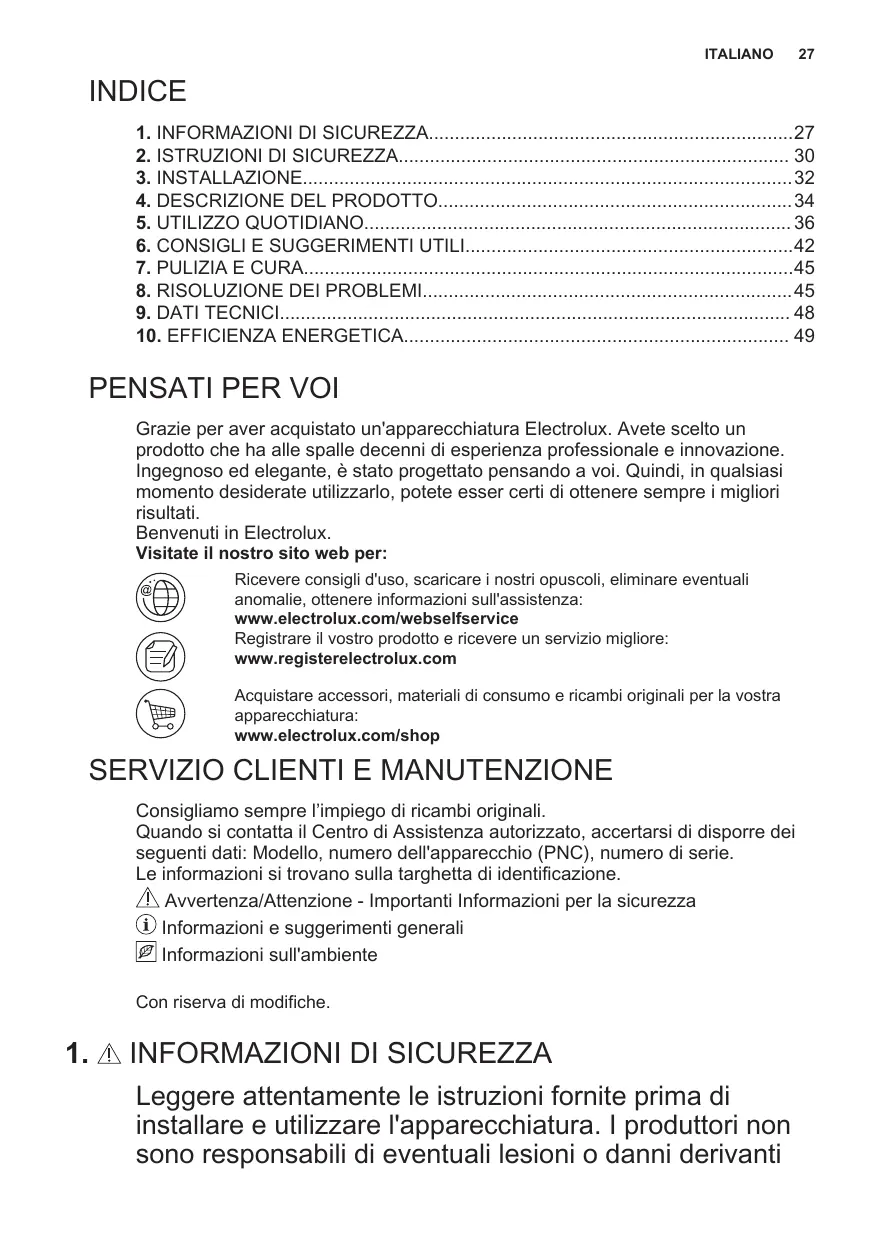 Grazie per aver acquistato un'apparecchiatura Electrolux. Avete scelto un prodotto che ha alle spalle decenni di esperienza professionale e innovazione. Ingegnoso ed elegante, è stato progettato pensando a voi. Quindi, in qualsiasi momento desiderate utilizzarlo, potete esser certi di ottenere sempre i migliori risultati. Benvenuti in Electrolux. Visitate il nostro sito web per: Ricevere consigli d'uso, scaricare i nostri opuscoli, eliminare eventuali anomalie, ottenere informazioni sull'assistenza: www.electrolux.com/webselfservice Registrare il vostro prodotto e ricevere un servizio migliore: www.registerelectrolux.com Acquistare accessori, materiali di consumo e ricambi originali per la vostra apparecchiatura: www.electrolux.com/shop