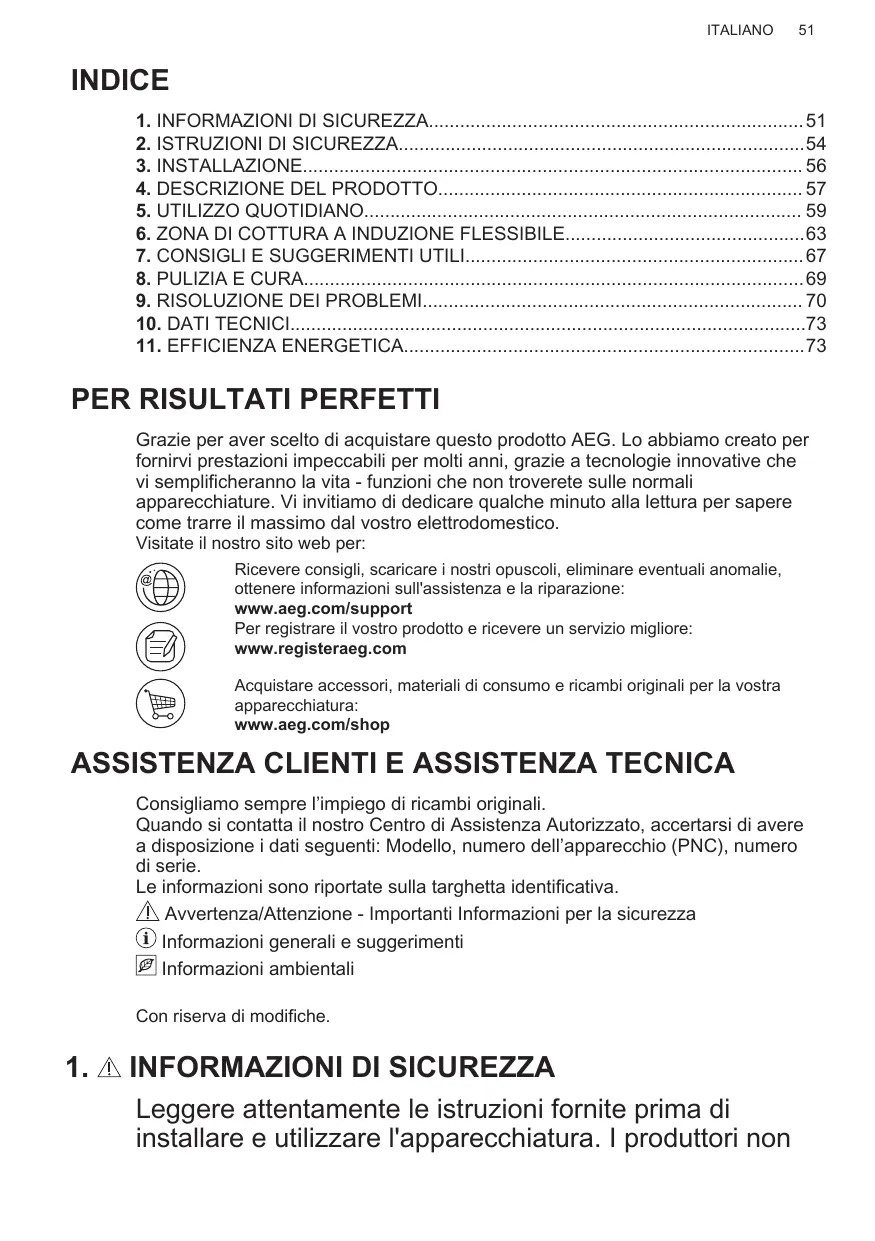 INDICE 1. INFORMAZIONI DI SICUREZZA 51 2. ISTRUZIONI DI SICUREZZA54 3. INSTALLAZIONE 56 4. DESCRIZIONE DEL PRODOTTO 57 5. UTILIZZO QUOTIDIANO 59 6. ZONA DI COTTURA A INDUZIONE FLESSIBILE63 7. CONSIGLI E SUGGERIMENTI UTILI 67 8. PULIZIA E CURA 69 9. RISOLUZIONE DEI PROBLEMI 70 10. DATI TECNICI73 11. EFFICIENZA ENERGETICA73