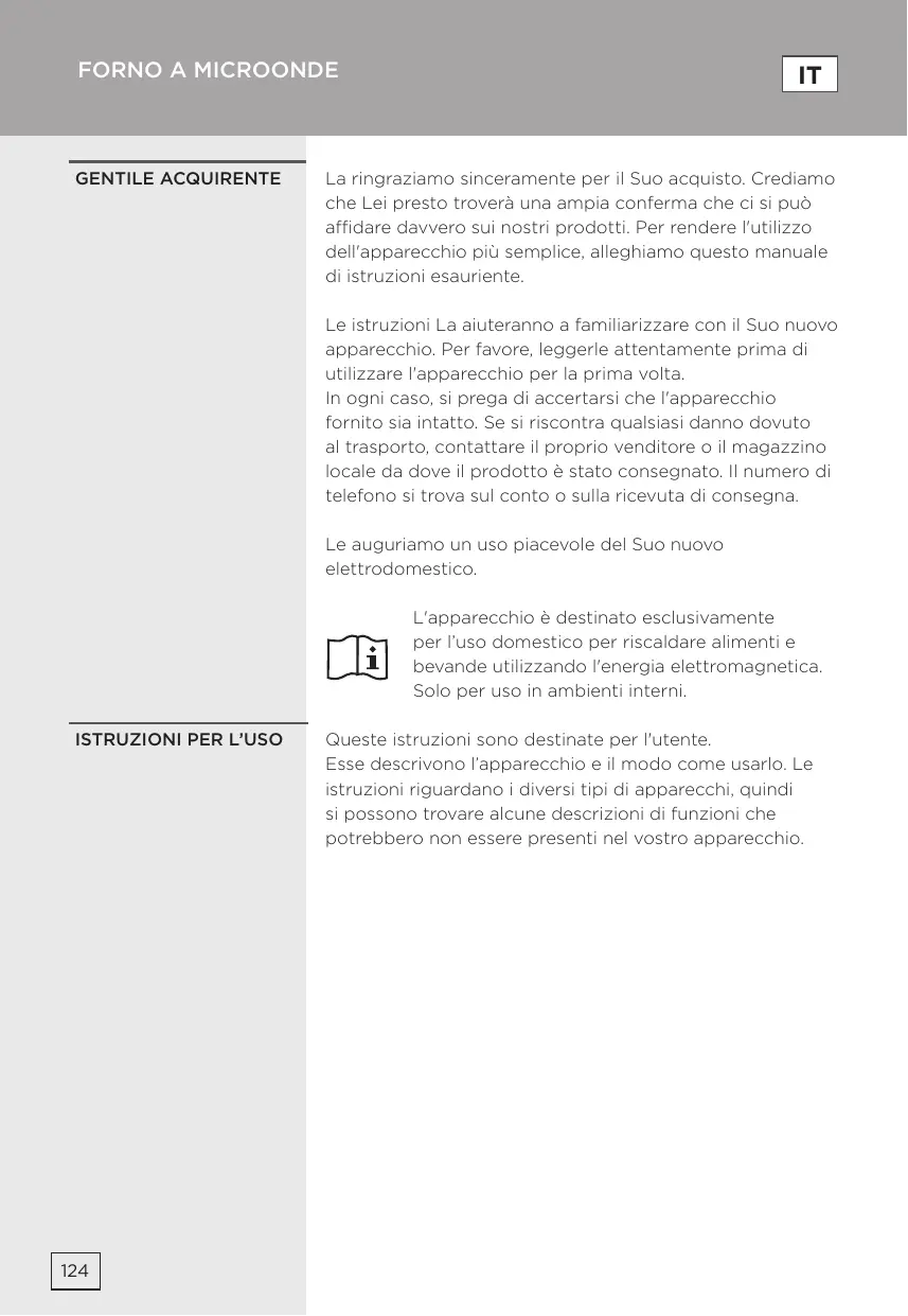 La ringraziamo sinceramente per il Suo acquisto. Crediamo che Lei presto troverà una ampia conferma che ci si può affidare davvero sui nostri prodotti. Per rendere l'utilizzo dell'apparecchio più semplice, alleghiamo questo manuale di istruzioni esauriente. Le istruzioni La aiuteranno a familiarizzare con il Suo nuovo apparecchio. Per favore, leggerle attentamente prima di utilizzare l'apparecchio per la prima volta. In ogni caso, si prega di accertarsi che l'apparecchio fornito sia intatto. Se si riscontra qualsiasi danno dovuto al trasporto, contattare il proprio venditore o il magazzino locale da dove il prodotto è stato consegnato. Il numero di telefono si trova sul conto o sulla ricevuta di consegna. Le auguriamo un uso piacevole del Suo nuovo elettrodomestico. L'apparecchio è destinato esclusivamente per l’uso domestico per riscaldare alimenti e bevande utilizzando l'energia elettromagnetica. Solo per uso in ambienti interni.