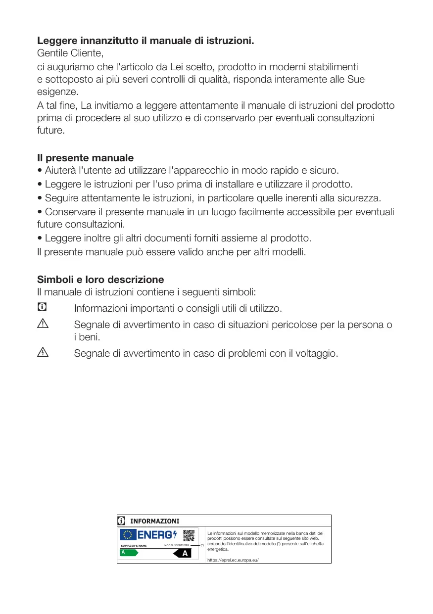 Le informazioni sul modello memorizzate nella banca dati dei prodotti possono essere consultate sul seguente sito web, cercando l'identificativo del modello (*) presente sull'etichetta energetica. https://eprel.ec.europa.eu/