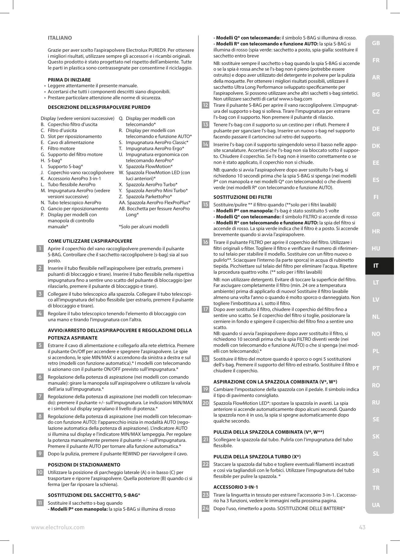 ITALIANO Grazie per aver scelto l'aspirapolvere Electrolux PURED9. Per ottenere i migliori risultati, utilizzare sempre gli accessori e i ricambi originali. Questo prodotto è stato progettato nel rispetto dell'ambiente. Tutte le parti in plastica sono contrassegnate per consentirne il riciclaggio.