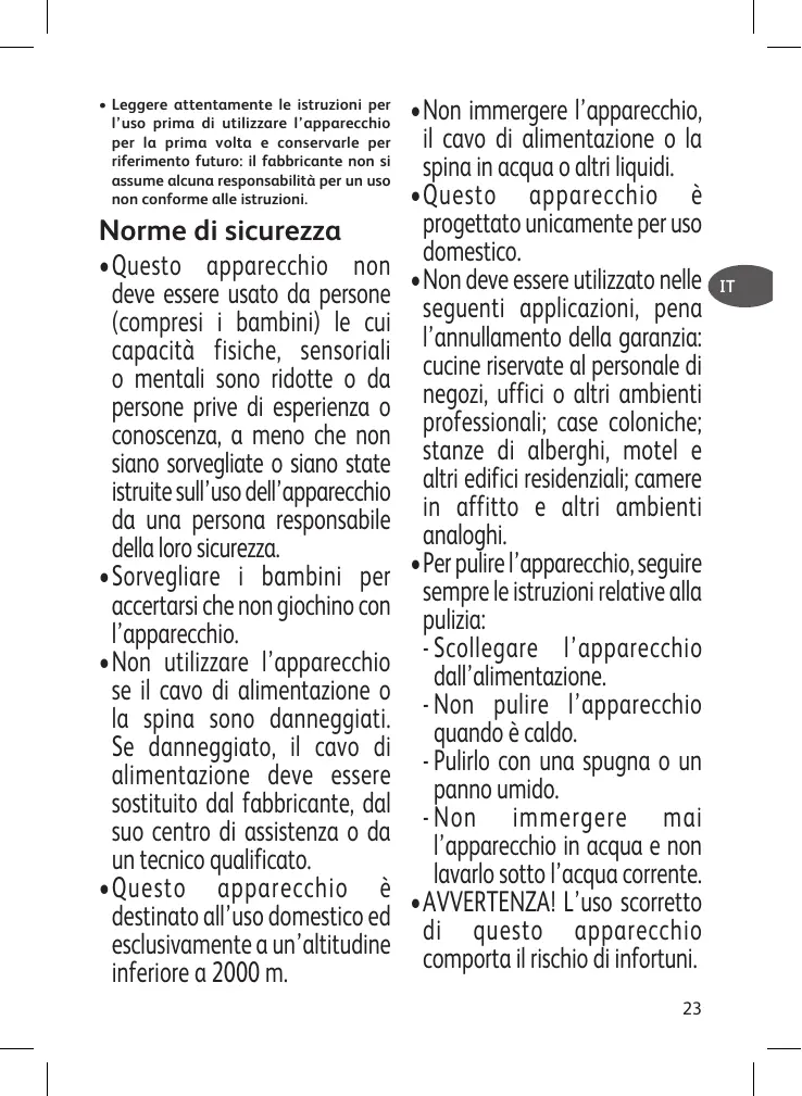 • Ne pas mettre l’appareil, le câble d’alimentation ou la fiche dans l’eau ou tout autre liquide. • Votre machine a été conçue pour un usage domestique seulement. • Elle n’a pas été conçue pour être utilisée dans les cas suivants qui ne sont pas couverts par la garantie: - Dans des coins de cuisines réservés au personnel dans des magasins, bureaux et autres environnements professionnels ; Dans des fermes ; Par les clients des hôtels, motels et autres environnements à caractère résidentiel ; Dans des environnements de type chambres d’hôtes. • Toujours suivre les instructions de nettoyage pour nettoyer votre appareil; - Débrancher l’appareil. - Ne pas nettoyer l’appareil chaud. - Nettoyer avec un chiffon ou une éponge humide. 7