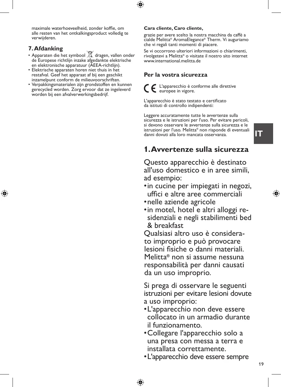 Hartelijk dank dat u gekozen hebt voor ons filterkoffiezetapparaat AromaElegance®. Wij wensen u veel plezier met uw aankoop. • L’ultima impostazione selezionata per il grado di durezza rimane attiva anche se si stacca l'apparecchio dalla presa di corrente.