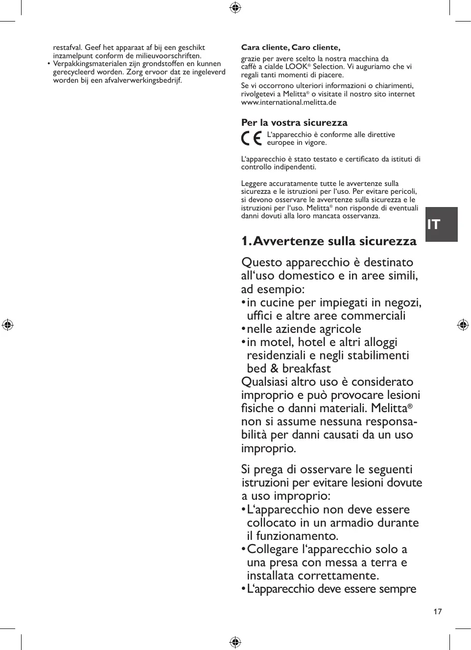 Scarica le istruzioni per il tuo Macchina da caffè in formato PDF gratuitamente! Trova il tuo manuale LOOK IV SELECTION - MELITTA e riprendi in mano il tuo dispositivo elettronico. In questa pagina sono pubblicati tutti i documenti necessari per l'utilizzo del tuo dispositivo. LOOK IV SELECTION del marchio MELITTA.