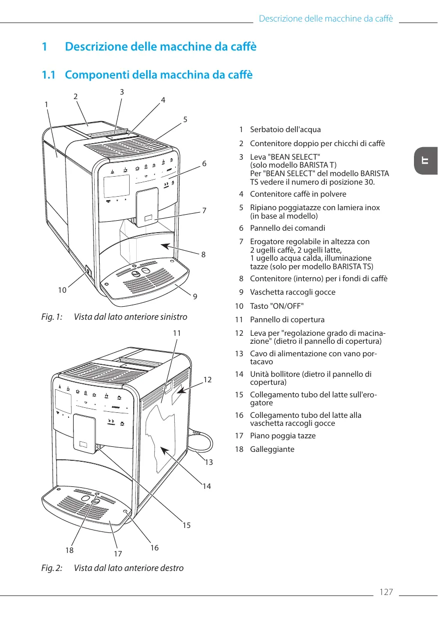 Fig. 1: 3 Leva "BEAN SELECT" (solo modello BARISTA T) Per "BEAN SELECT" del modello BARISTA TS vedere il numero di posizione 30. 4 Contenitore caffè in polvere 5 Ripiano poggiatazze con lamiera inox (in base al modello) 6 Pannello dei comandi 7 Erogatore regolabile in altezza con 2 ugelli caffè, 2 ugelli latte, 1 ugello acqua calda, illuminazione tazze (solo per modello BARISTA TS) 8 Contenitore (interno) per i fondi di caffè 9 Vaschetta raccogli gocce
