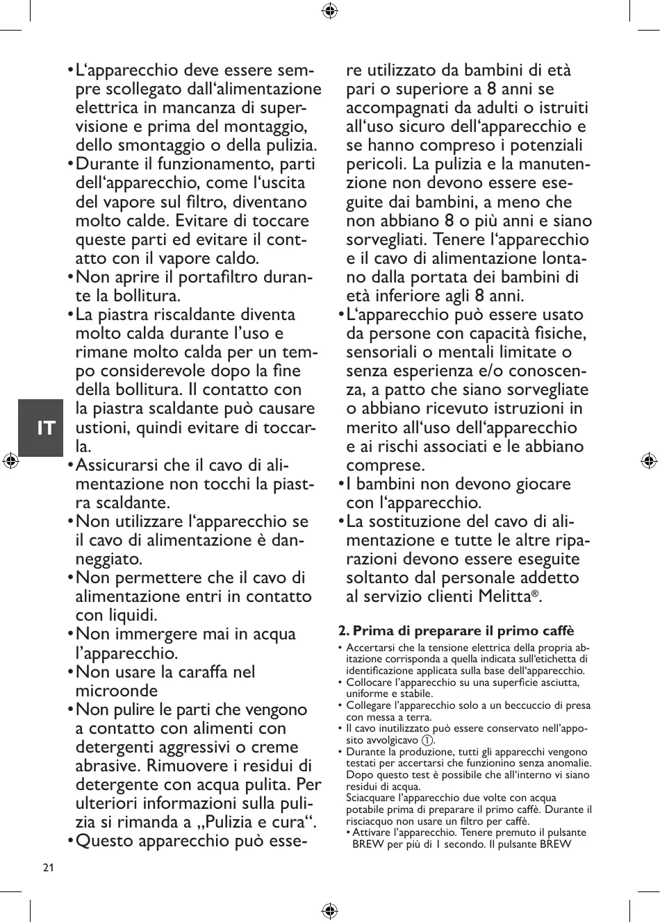 à récurer. Nettoyer les résidus de détergent à l‘eau claire. Vous trouverez de plus amples informations sur le nettoyage dans la partie « Nettoyage et entretien ». • Cet appareil peut être utilisé par des enfants de 8 ans ou plus s‘ils sont surveillés ou s‘ils ont été instruits quant à l‘utilisati- FR on de l‘appareil et aux dangers associés et s‘ils ont compris les dangers potentiels. Le nettoyage et l‘entretien de l‘appareil ne doivent pas être effectués par des enfants à moins qu‘ils aient au minimum 8 ans et soient surveillés. L‘appareil et le cordon d‘alimentation doivent être mis hors de portée des enfants de moins de 8 ans. • Cet appareil peut être utilisé par des personnes présentant des aptitudes physiques, sensorielles ou mentales limitées ou un manque d‘expérience et/ou de connaissances si elles sont surveillées ou si elles ont été instruites quant à l‘utilisation de l‘appareil et aux dangers associés et si elles ont compris les dangers potentiels. • Les enfants ne doivent pas jouer avec l‘appareil. • Le remplacement du cordon d‘alimentation et toute autre réparation doivent uniquement être effectués par le service après-vente de Melitta® ou par 12