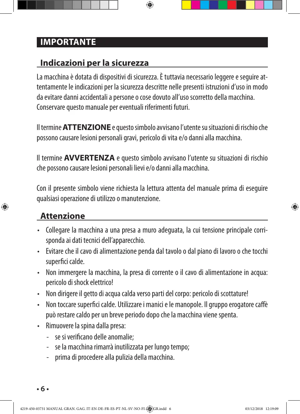 • Brancher la machine à une prise murale appropriée, dont la tension principale correspond aux données techniques de l'appareil. • Le câble d'alimentation ne doit pas pendre de la table ou du plan de travail et ne doit pas être en contact avec des surfaces chaudes. • Ne pas immerger la machine, la prise de courant ou le câble d'alimentation dans l'eau : danger de choc électrique ! • Ne jamais diriger le jet d’eau chaude vers des parties du corps : danger de brûlures ! • Ne pas toucher les surfaces chaudes. Utiliser les poignées et les boutons. Après l'arrêt de la machine, le groupe de distribution du café peut demeurer chaud pendant une courte période. • Débrancher la fiche de la prise murale : - en cas d'anomalies ; - si la machine reste inactive pendant une longue période ; - avant de procéder au nettoyage de la machine. • 42 • 4219-450-03731 MANUAL GRAN. GAG. IT-EN-DE-FR-ES-PT-NL-SV-NO-FI-DA-GR.indd 42