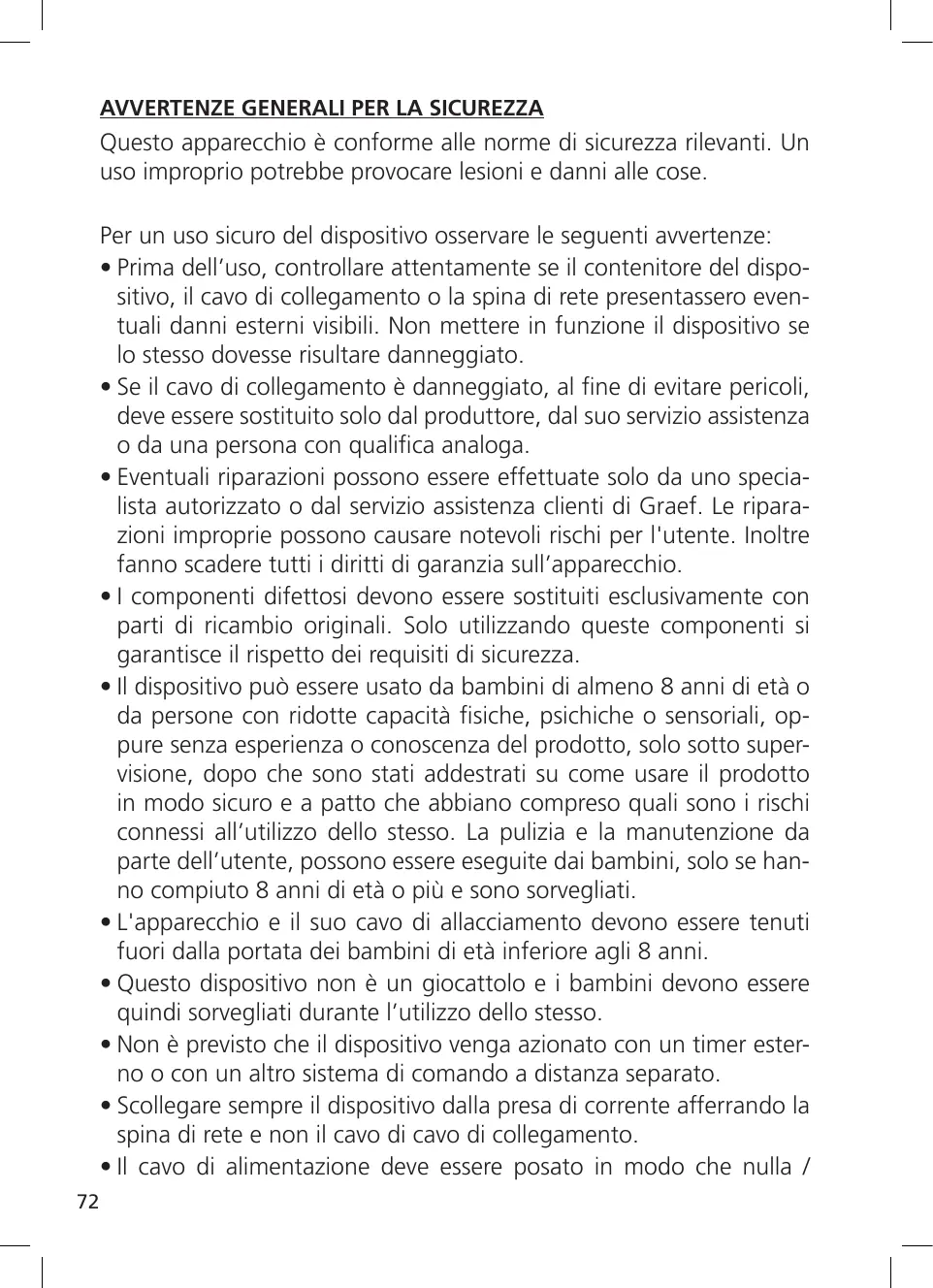 - Eventuali riparazioni possono essere effettuate solo da uno specialista autorizzato o dal servizio assistenza clienti di Graef. Le riparazioni improprie possono causare notevoli rischi per l'utente. Inoltre fanno scadere tutti i diritti di garanzia sull’apparecchio.