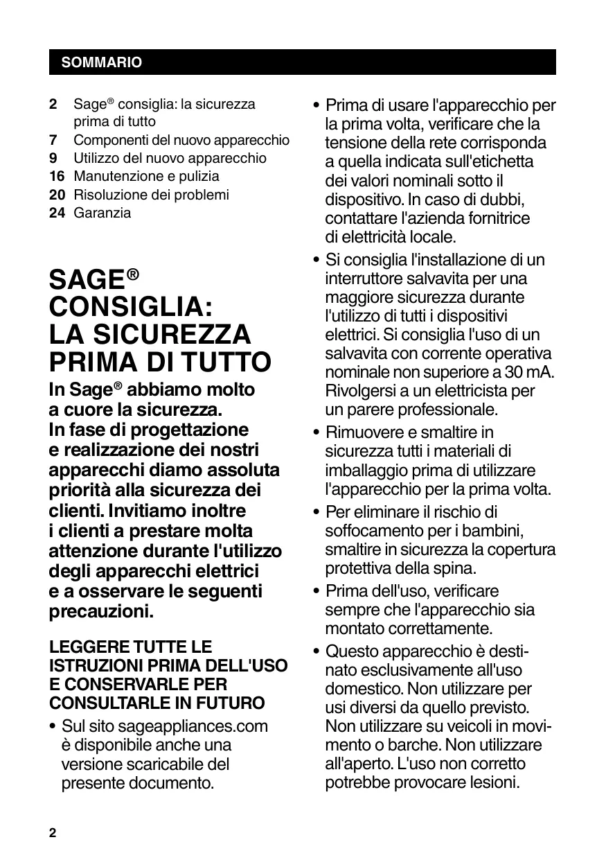 GUIDA RAPIDA INTESTAZIONE DI PAGINA..... SOMMARIO Sage® consiglia: la sicurezza prima di tutto 7 Componenti del nuovo apparecchio 9 Utilizzo del nuovo apparecchio 16 Manutenzione e pulizia 20 Risoluzione dei problemi 24 Garanzia